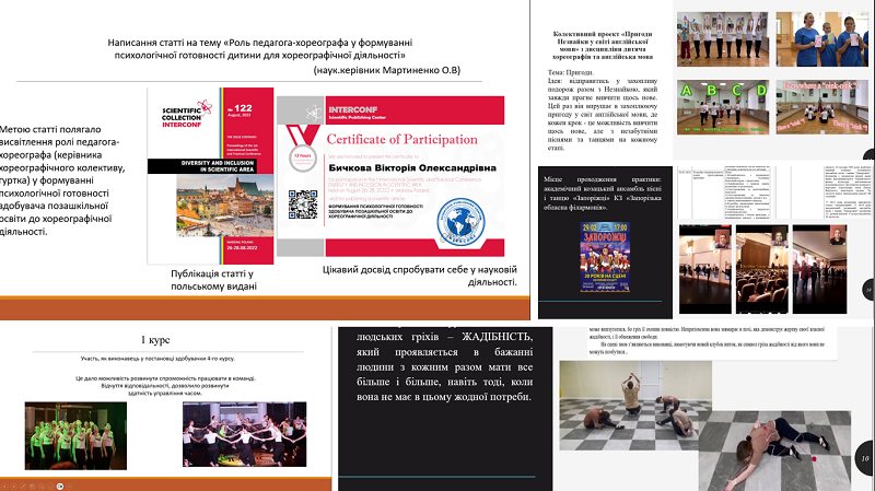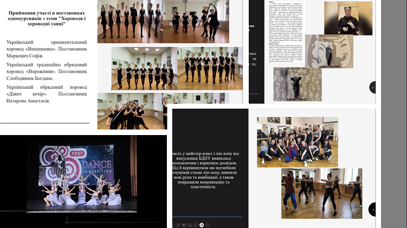 Зацікавленість студентів окресленою проблематикою виявилася і під час формування індивідуальної траєкторії навчання через вибіркову компоненту «Блогінг» (викладач – доцент кафедри соціальних комунікацій Роман Костромицький), метою якої є формування у здобувачів навичок створення та ведення авторського блогу професійного спрямування. Крім того, цьогоріч у зміст І етапу Всеукраїнської олімпіади з хореографії було включено завдання щодо презентації ЕСЕ на тему «Образ ідеального хореографа», що визначило бачення студентами сучасного фахівця.