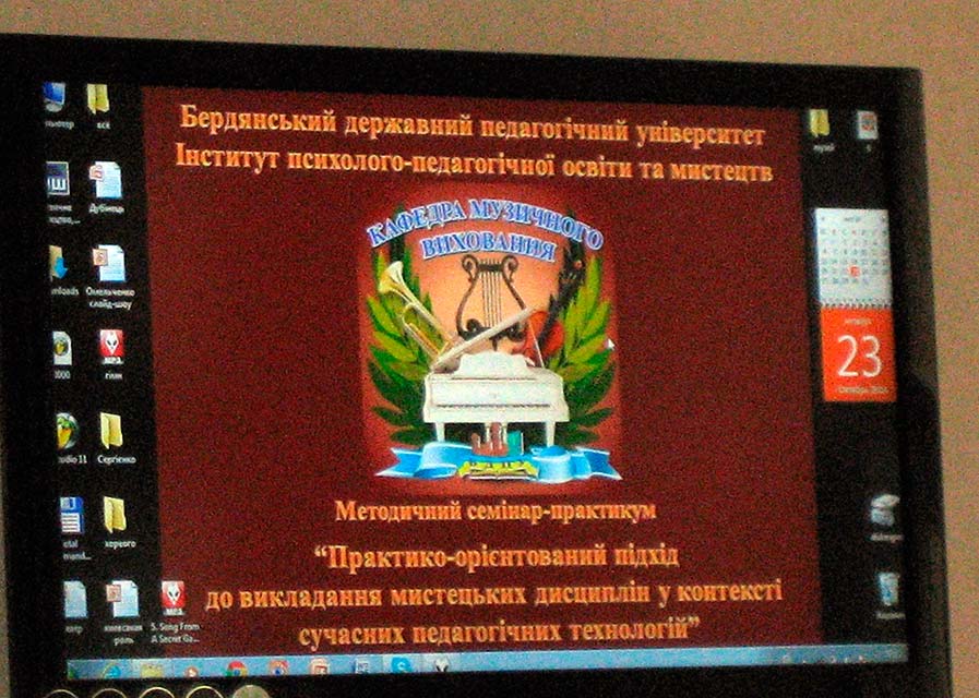 …А якщо конкретніше, то саме такий підхід демонстрували сьогодні, 23-го жовтня, учасники методичного семінару-практикуму під назвою «Практико-орієнтований підхід до викладання мистецьких дисциплін у контексті сучасних педагогічних технологій», що проходив в ауд. 5в-12 Інституту психолого-педагогічної освіти та мистецтв. Окрім викладачів та студентів кафедри музичного виховання в семінарі брали участь представники відділу народної освіти, вчителі музичного мистецтва та художньої культури шкіл району (див. світлини).