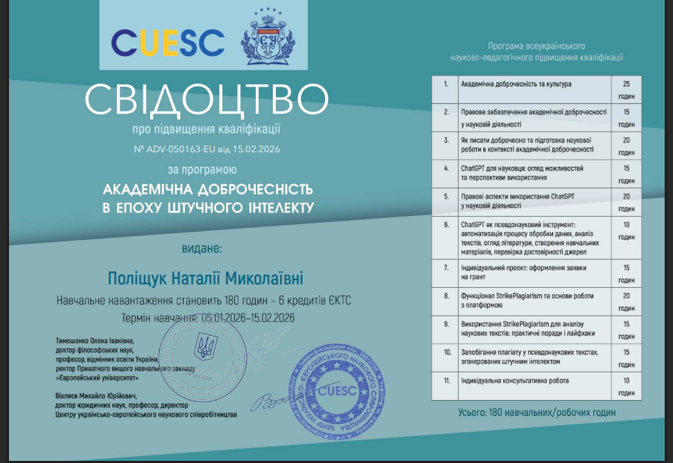 Участь у зазначеному заході стала вагомою складовою професійного розвитку та науково-педагогічного вдосконалення, оскільки програма підвищення кваліфікації була спрямована на осмислення сучасних викликів, пов’язаних із дотриманням принципів академічної доброчесності в умовах стрімкого розвитку цифрових технологій та активного впровадження інструментів штучного інтелекту в освітню й наукову діяльність.