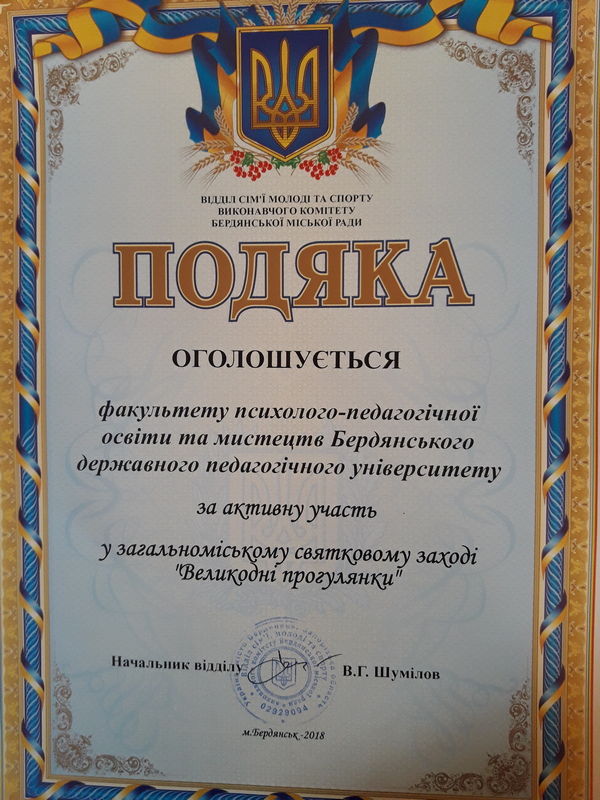 З нагоди свята Світлого Христового Воскресіння, з метою поглиблення знань традицій українського народу, духовного розвитку, розвитку творчих та інтелектуальних здібностей молоді міста 04 квітня у художньому музеї ім. І. І. Бродського відбувся загальноміський святковий захід «Великодні прогулянки». У цьому заході брали участь студенти спеціальності музичне мистецтво факультету психолого-педагогічної освіти та мистецтв, кафедри теорії та методики навчання мистецьких дисциплін.