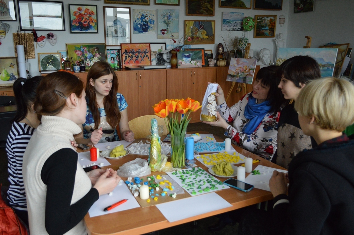 День видався насиченим і для студентів спеціалізації «Образотворче мистецтво», які активно долучилися до проведення заходу «Арт-терапевтичні техніки в початковій школі» (організатор – старший викладач Тетяна Володько ). Використовуючи сучасну техніку «холодний фарфор», студенти ліпили троянди для оздоблення декоративних пляшок та свічок до Великодня. Для учнів початкової школи використання техніки «холодний фарфор» – розвиток моторики рук. Різноманіть кольорів, розмірів виліплених троянд – естетичний та заспокійливий захід у нашому неспокійному сьогоденні.