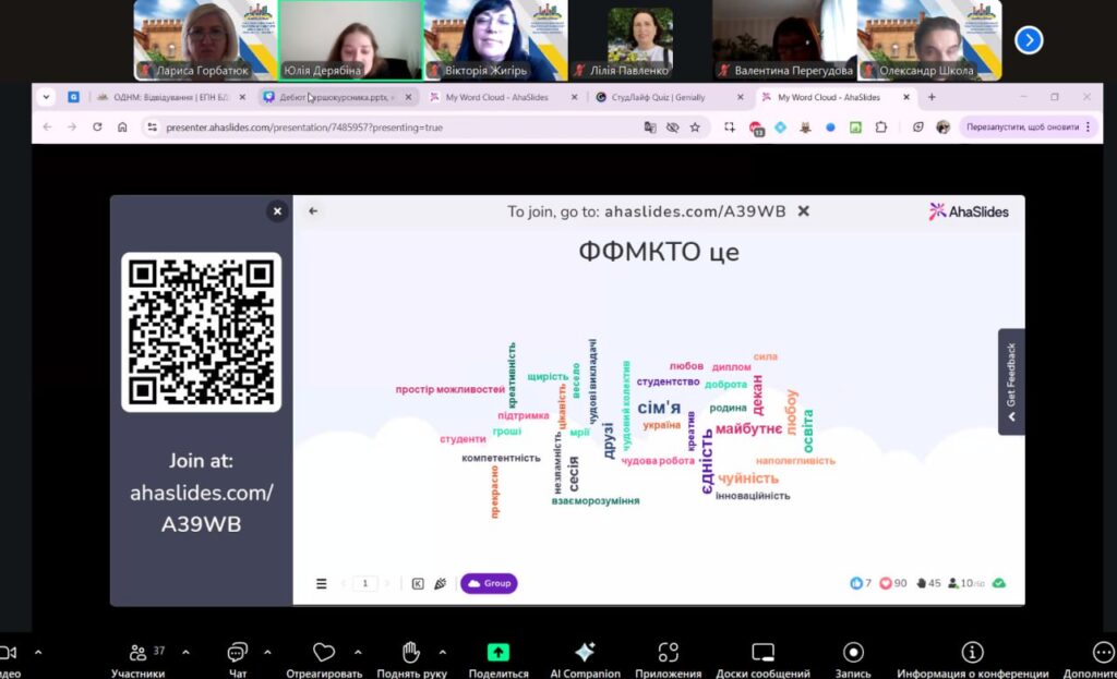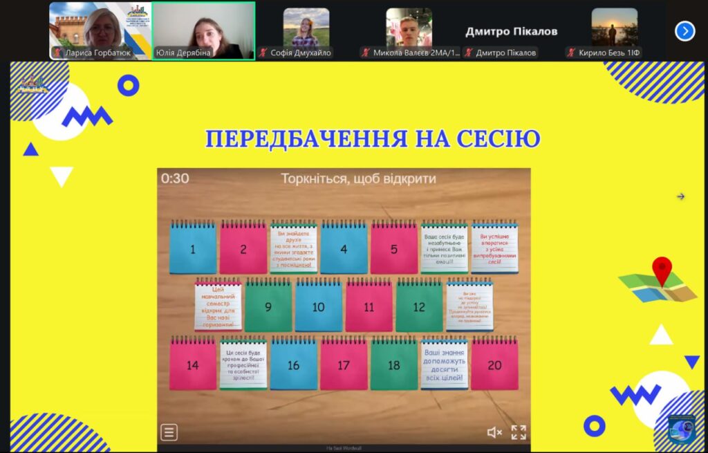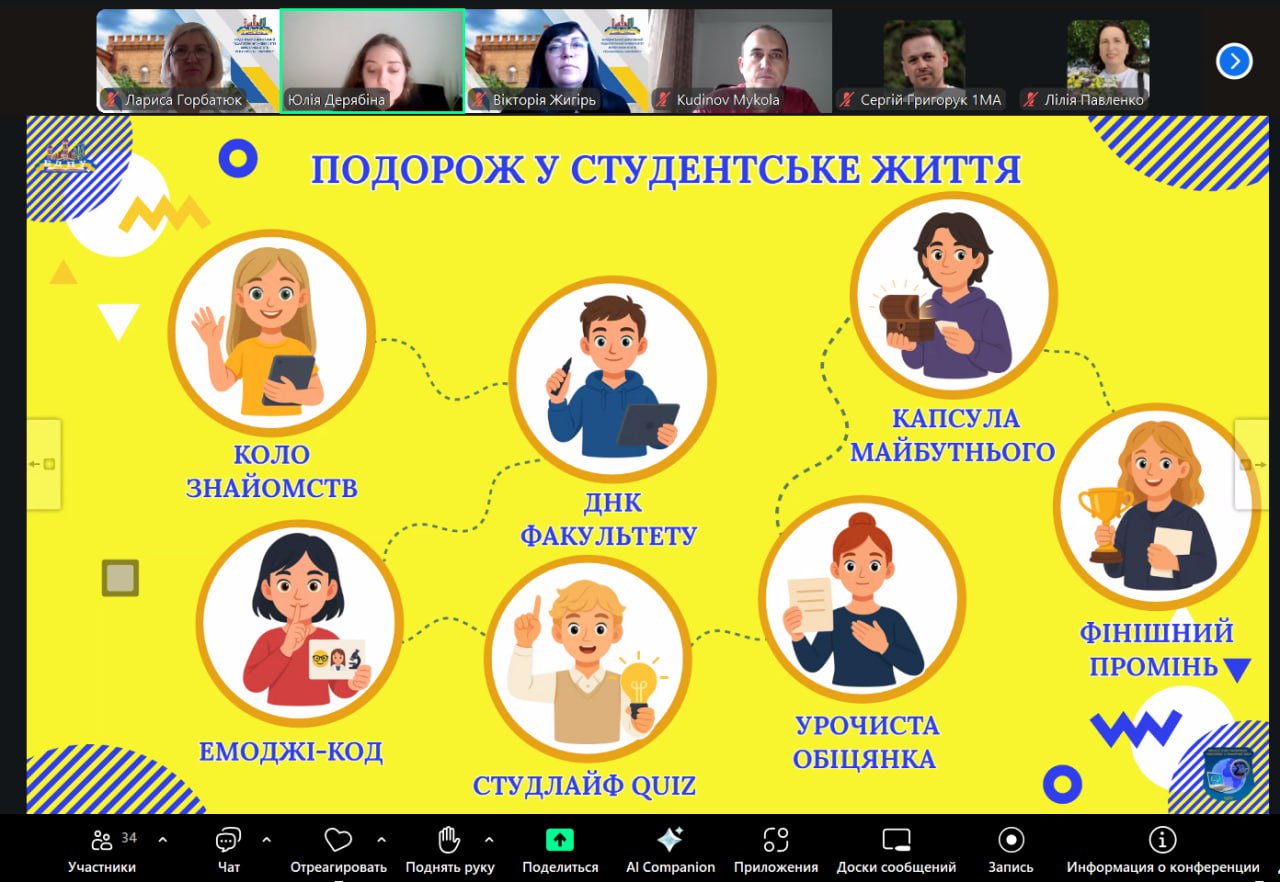 На станції «Коло Знайомств» студенти переглянули відеоролик про себе, відчуваючи єднання, незважаючи на відстань. Далі, на станції «ДНК Факультету», присутні активно використовували QR–код та формували динамічну «Хмару Слів», де домінували асоціації з факультетом. Інтерактив продовжився на станції «ЕмоджіКод», де студенти оперативно вгадували спеціальності, надсилаючи відповіді у чат, та перевірили знання у «СтудЛайф Quiz» на платформі Genially.