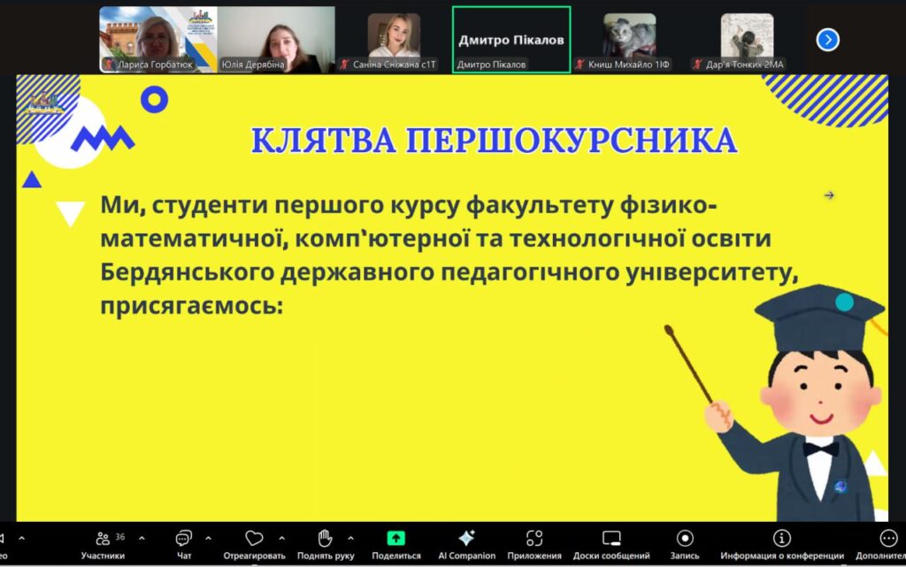 17 листопада відбулася урочиста церемонія посвяти першокурсників факультету фізико–математичної, комп’ютерної та технологічної освіти (ФФМКТО) під назвою «Подорож у студентське життя». Захід, що відбувся в онлайн форматі, зібрав здобувачів, викладачів та гостей на спільній віртуальній платформі.