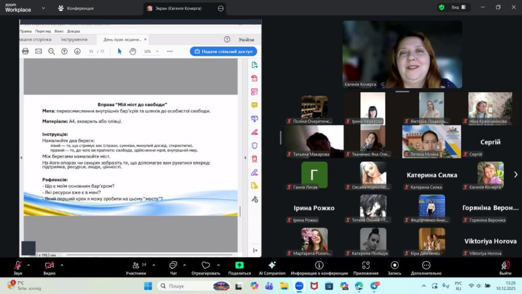 До Міжнародного дня прав людини на факультеті психолого-педагогічної освіти та мистецтв БДПУ відбувся онлайн-воркшоп «Права людини в психологічному вимірі», спікеркою якого стала Євгенія Кочерга, кандидатка педагогічних наук, доцентка кафедри психології, членкиня Всеукраїнської арттерапевтичної асоціації.