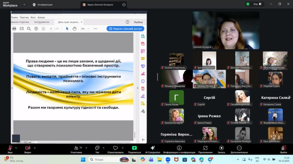 Учасники обговорили, як поняття гідності, свободи, рівності та емоційної недоторканності інтегруються у психологічну практику та впливають на якість допомоги. Також було розглянуто психологічні наслідки порушення прав людини та роль психолога у відновленні внутрішньої стійкості.