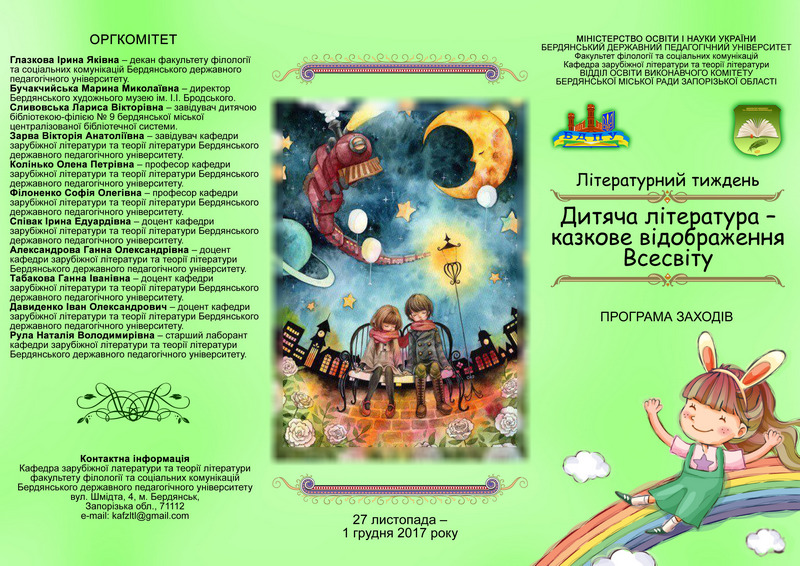 З 27 листопада по 1 грудня на факультеті філології та соціальних комунікацій пройшов літературний тиждень «Дитяча література – казкове відображення Всесвіту». Організатор заходів – кафедра зарубіжної літератури та теорії літератури (https://bdpu.org.ua/faculties/ffsk/structure-ffsk/kaf-zar-lit/) на чолі з доктором філологічних наук, професором Зарвою Вікторією (https://bdpu.org.ua/faculties/ffsk/structure-ffsk/kaf-zar-lit/composition-kaf-zar-lit/zarva/). Особлива подяка за співпрацю працівникам дитячої бібліотеки-філії № 9, художнього музею ім. І. І. Бродського, а також учителям загальноосвітніх шкіл міста.