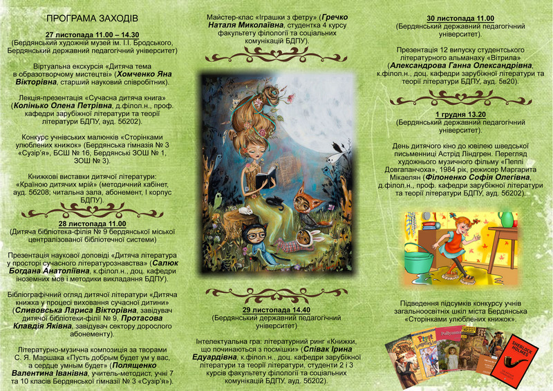 У вівторок, 28 листопада, у дитячій бібліотеці-філії №9 спільно з кафедрою зарубіжної літератури та теорії літератури БДПУ було проведено такі заходи: бібліографічний огляд дитячої літератури «Дитяча книжка в процесі виховання сучасної дитини» (підготували завідувач дитячої бібліотеки Сливовська Лариса та завідувач сектору дорослого абонементу Протасова Клавдія); доповідь «Дитяча література у просторі сучасного літературознавства» (кандидат філологічних наук, доцент кафедри іноземних мов і методики викладання Салюк Богдана (https://bdpu.org.ua/faculties/ffsk/structure-ffsk/kaf-in-mov/composition-kaf-in-mov/salyuk/); літературно-музична композиція за творами Самуїла Маршака до ювілею відомого поета (учні 7 та 10 класів гімназії № 3 «Сузір’я» під керівництвом учителя-методиста Полященко Валентини); майстер-клас «Іграшки з фетру» (підготували та провели студенти факультету філології та соціальних комунікацій Гречко Наталія та Кальма Марія).