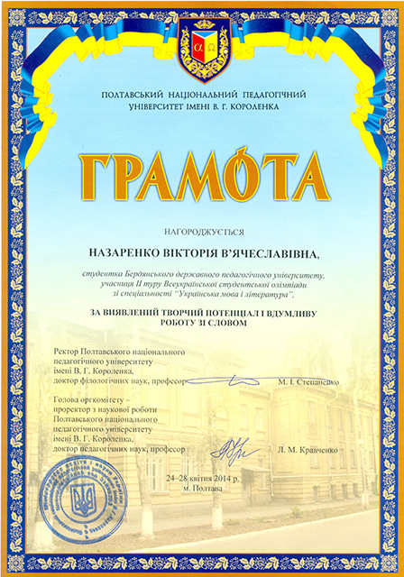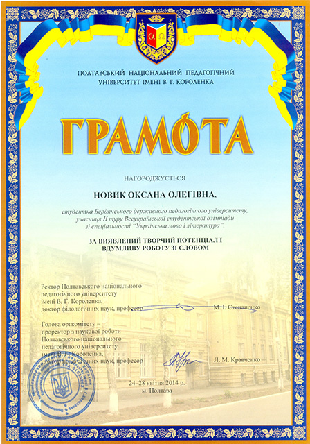 З 24 по 28 квітня ц. р. в Полтаві проходив II етап Всеукраїнської студентської олімпіади з української мови та літератури, у якому взяли участь студенти зі всіх куточків України. Наш університет представляли студенти Інституту філології та соціальних комунікацій Вікторія Назаренко (6 курс) та Оксана Новик (4 курс). В учасників олімпіади була можливість не лише проявити свої знання, а й набути нового досвіду. Олімпіада тривала два дні: першого дня розв’язували завдання з української літератури, а наступного – з мови. Завдання були не з легких, але наші дівчата їх гідно витримали: по закінченні олімпіади вони отримали грамоти за виявлений творчий потенціал і вдумливу роботу зі словом (див. світлини).