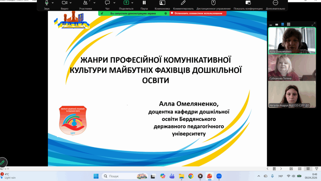 8 квітня 2026 року доцентка Алла Омеляненко представляла кафедру дошкільної освіти  БДПУ (завідувачка доцентка Ірина Улюкаєва) на 4 Всеукраїнському науково-практичному онлайн-форумі «Педагог 21 століття: професійний та особистісний розвиток». Захід був організований Київським столичним університетом імені Бориса Грінченка.