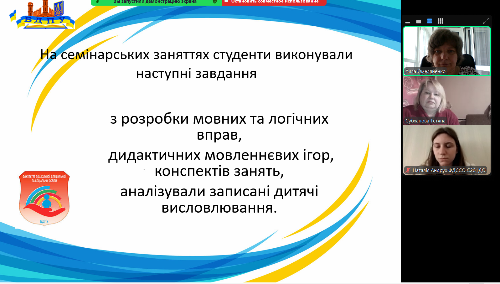 Доповідачка висвітлила власний досвід роботи у підготовці здобувачів спеціальності А2 «Дошкільна освіта» освітньо-професійного рівня «бакалавр». Алла Омеляненко підкреслила, робота з використання мовленнєвого жанру «роздуму» в педагогічній діяльності сприяла розвитку мовленнєвої рефлексії, лінгвістичного та логічного мислення, комплексу професійних мовленнєвих вмінь, що складають основу комунікативної культури майбутнього вихователя дітей дошкільного віку.
