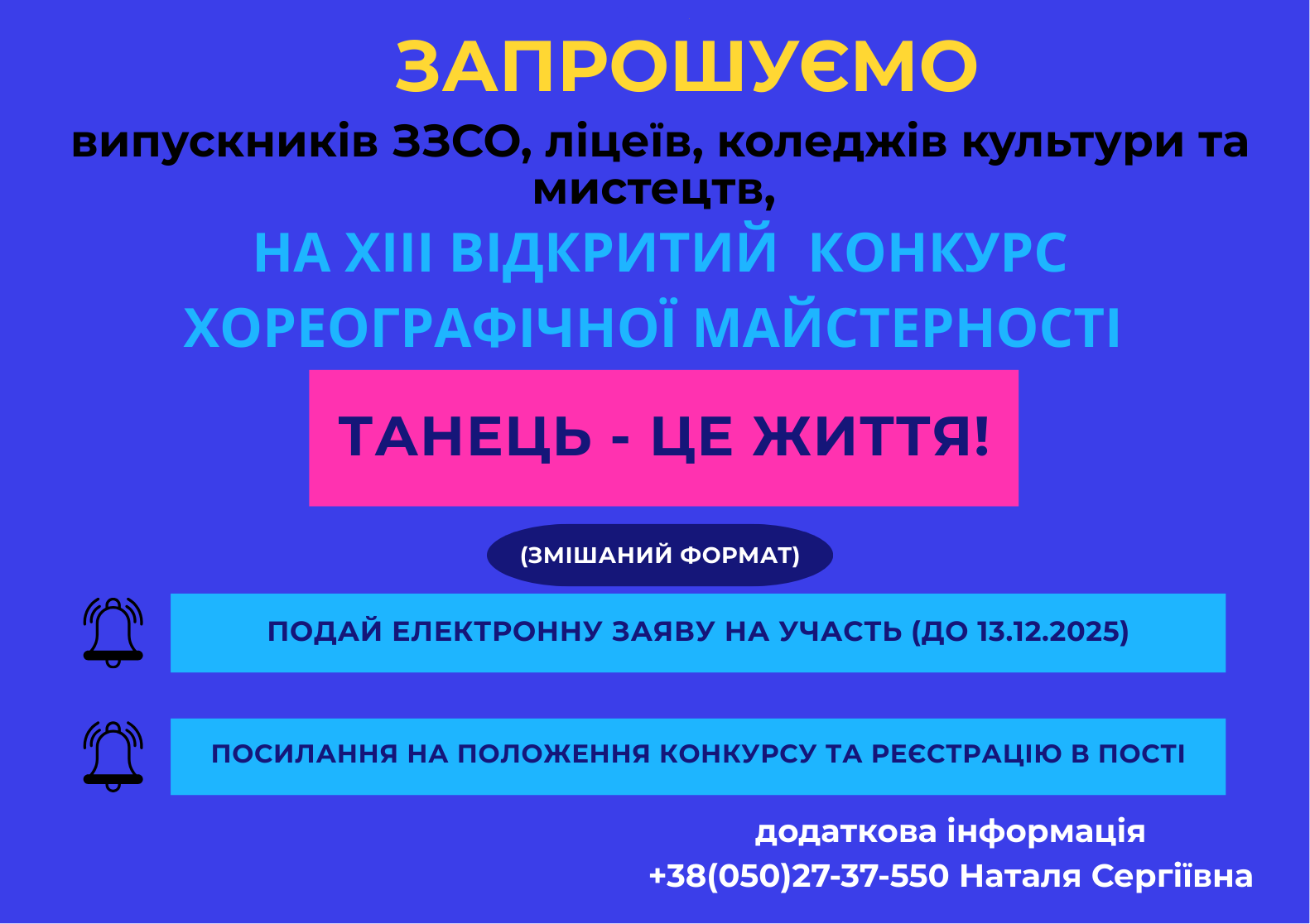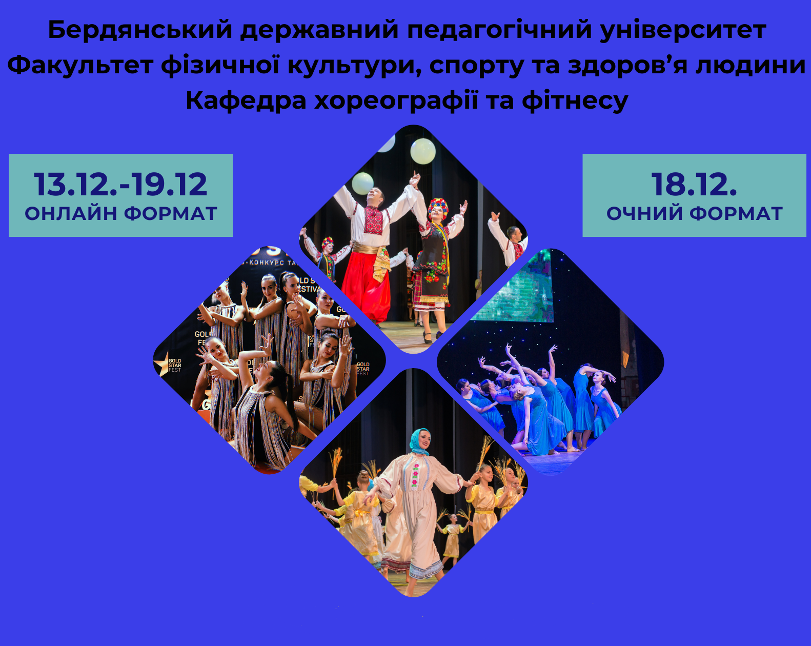 Шановні друзі! Кафедра хореографії та фітнесу факультету фізичної культури, спорту та здоров’я людини Бердянського державного педагогічного університету запрошує Вас узяти участь у конкурсі хореографічної майстерності «Танець – це життя!» (змішанийформат).