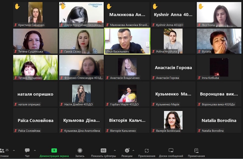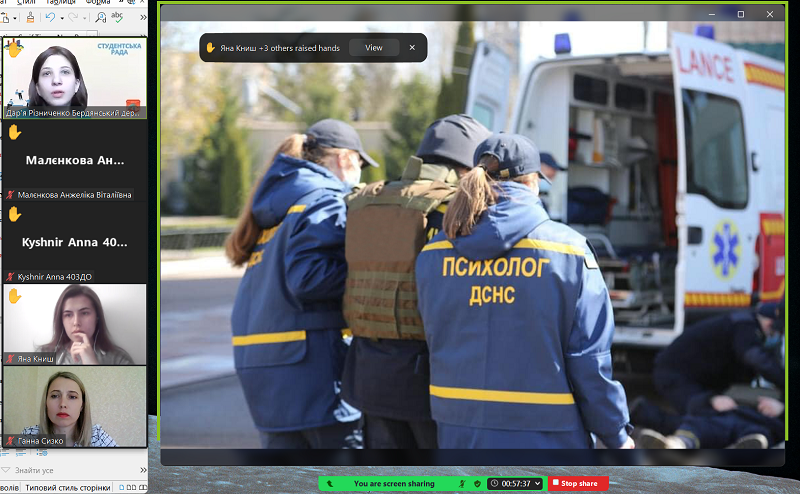 Присвячена Міжнародному дню психолога, 15.04.2024 року відбулась зустріч із психологом-практиком, під час вивчення ОК Психологія надзвичайних ситуацій, зі здобувачами факультету дошкільної, спеціальної та соціальної освіти Бердянського державного педагогічного університету. Запрошеним спікером був начальник відділу психологічного забезпечення Головного управління Державної служби з надзвичайних ситуацій України у Запорізькій області, майор служби цивільного захисту Бородовко Ілля Васильович.