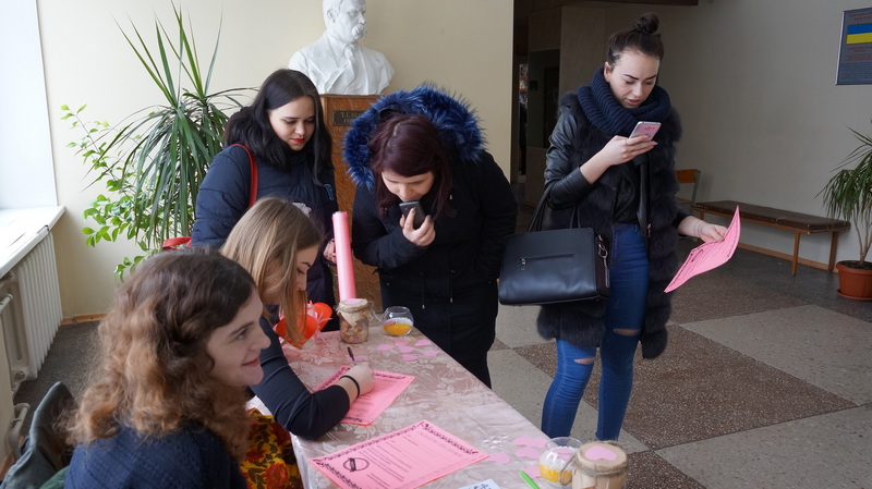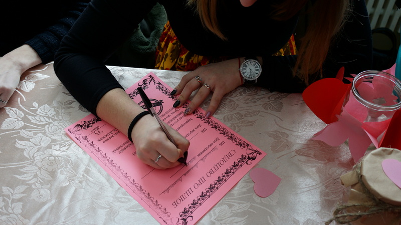 Усі закохані пари нашого університету могли «зареєструвати» свій шлюб, як доказ свого кохання одне до одного. Реєстратором шлюбу виступила студентка 3 курсу ФФСК Тетяна Черепанова, а щедрою на ворожіння циганкою – студентка 1 курсу ФФСК Анастасія Ємельяненко. У цей день наш РАЦС не відмовив жодному своєму клієнту. А підрахунок вийшов зворушливим: було видано майже 80 «свідоцтв».