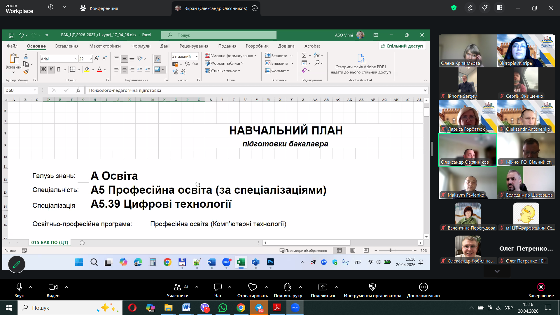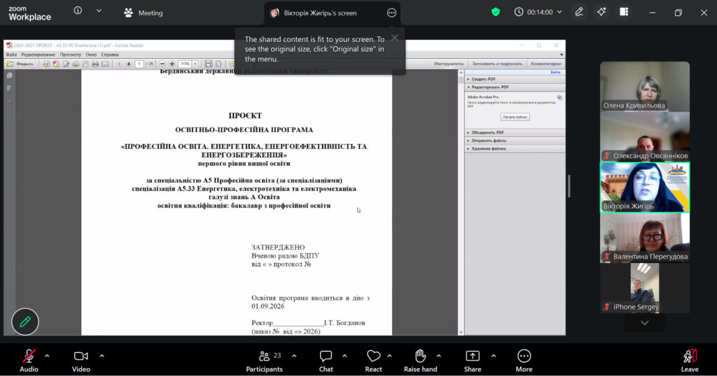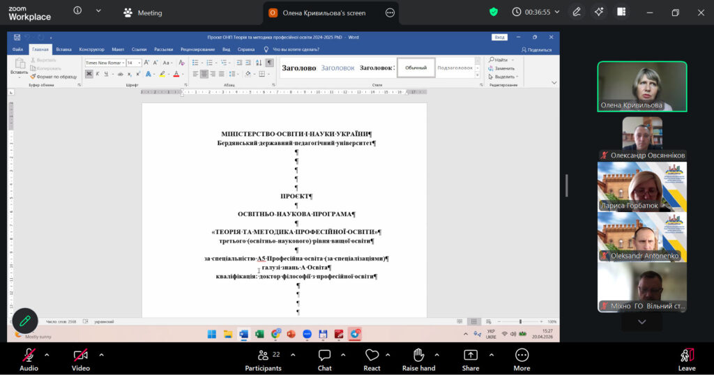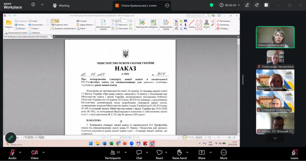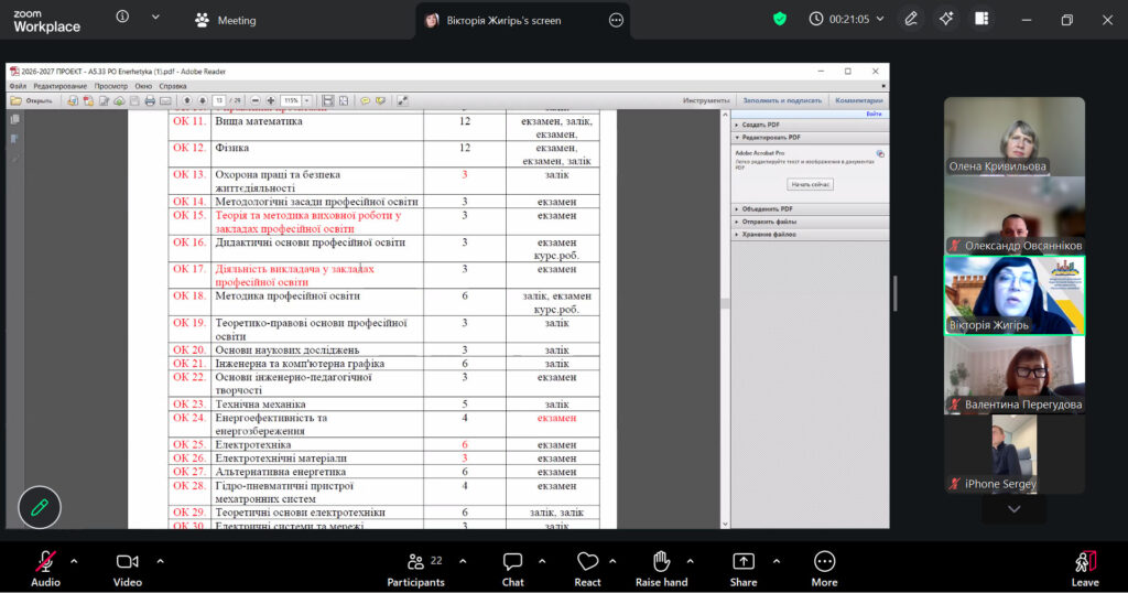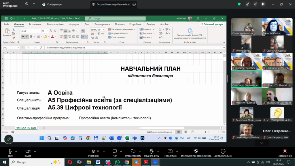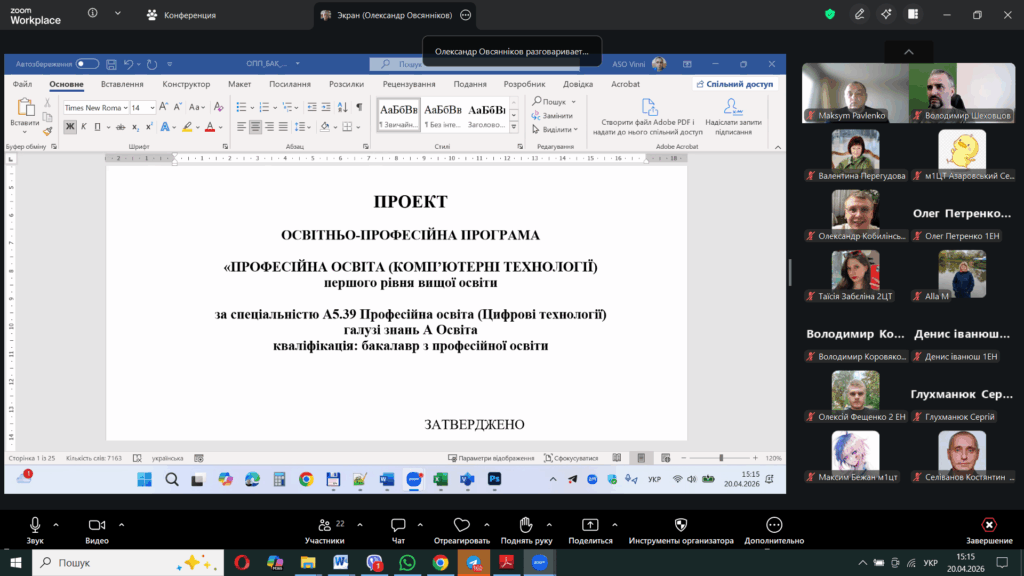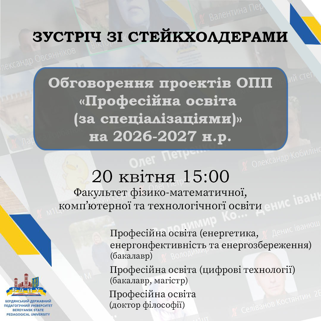 20 квітня 2026 року відбулась чергова зустріч гарантів, робочих груп, здобувачів вищої освіти першого бакалаврського рівня – ОПП «Професійна освіта. Енергоефективність та енергозбереження», ОПП «Професійна освіта. Комп’ютерні технології»; другого (магістерського) – ОПП «Професійна освіта. Комп’ютерні технології») та третього (доктор філософії) – ОНП «Теорія та методика професійної освіти» зі стейкголдерами (представники закладів професійної, фахової передвищої освіти, бізнесу та підприємств). Предметом зустрічі було активне обговорення актуальних питань підготовки фахівців, відповідності освітніх програм сучасним вимогам ринку праці та перспектив співпраці між освітніми закладами та роботодавцями.
