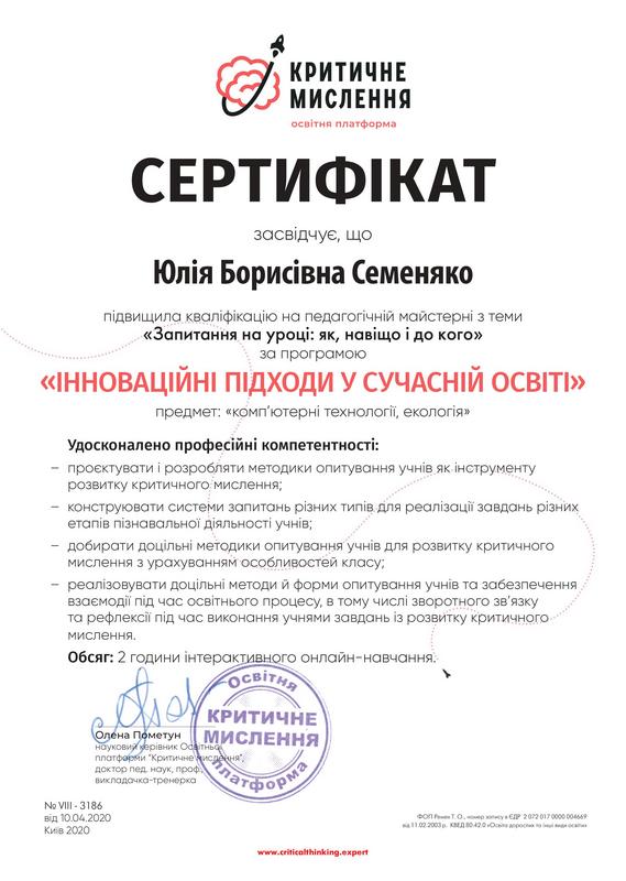 З метою осучаснення змісту дисципліни «Комп’ютерні технології в роботі з дітьми», а саме змістового модуля «Критичне мислення педагога» Юлія СЕМЕНЯКО була учасником педагогічної майстерні з теми «Запитання на занятті: як, навіщо і до кого» за програмою «Інноваційні підходи у сучасній освіті». Отримана інформація сприятиме удосконалено медіакомпетентності майбутніх вихователів. Зокрема, здобувачі навчаться: