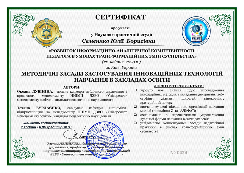 Участь Юлії СЕМЕНЯКО у науково-практичній студії «Методичні засади застосування інноваційних технологій навчання в закладах освіти» доцільна для наповнення змістових модулів дисципліни «Сучасні освітньо-ігрові технології в ЗДО». Здобувачі спеціальності 012 дізнаються про особливості інноваційних методів навчання (веб-серфінг, діамант цінностей, кінокоучінг, критерійний покер та ін.), перспективи впровадження дуальної форми навчання, сучасні підходи до навчання дітей поколінь «Альфа» та «Z».