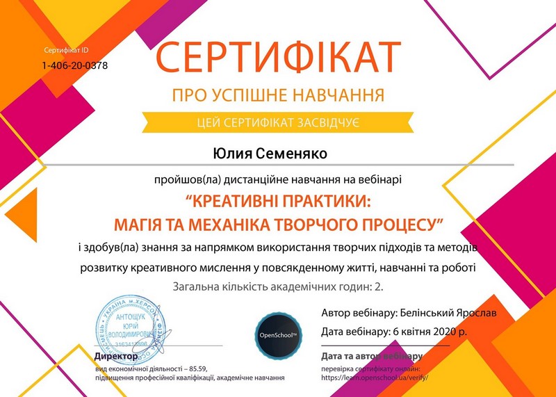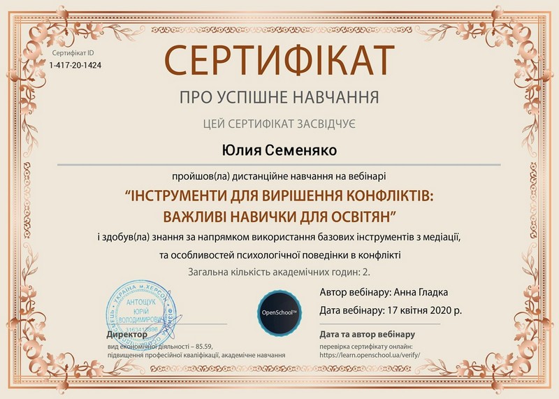 Окрім того, Юлія Семеняко взяла участь у вебінарі «Інструменти для вирішення конфліктів: важливі навички для освітян». Інформація про психологічні особливості поведінки в конфлікті, потенційні можливості конфлікта, інструменти медіації – стане у нагоді під час вивчення дисциплін «Педагогіка дошкільна», «Управління в системі дошкільної освіти», «Педагогічна творчість». Здобувачі спеціальності 012 Дошкільна освіта навчаться шукати та знаходити кроки до порозуміння; розробляти алгоритм ефективного діалогу; застосовувати дієві інструменти медіації; ефективно комунікувати та взаємодіяти з іншими.