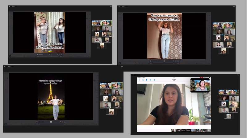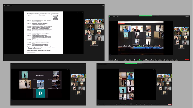 Модераторкою звітної конференції виступила керівниця практики доцентка кафедри теорії та методики навчання мистецьких дисциплін Олена Мартиненко, яка за сумісництвом обіймає посаду керівника ансамблю естрадного танцю «МарЛен» Центру дитячої та юнацької творчості ім. Є. Руднєвої (м. Бердянськ). Кожен студент мав можливість презентувати звіт з практики, відповісти на запитання та отримати відгуки від педагогів колективу. Звітна документація була завантажена практикантами завчасно до системи MOODLE та демонструвалася під час конференції іншим присутнім задля відкритості та публічності https://youtu.be/vQw_-bFFHiE