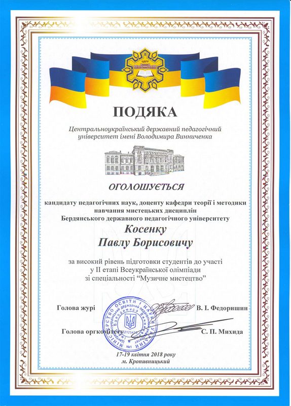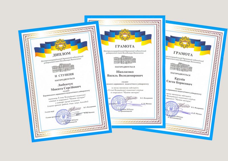 Із 17 по 19 квітня ц. р. у Центральноукраїнському державному педагогічному університеті імені Володимира Винниченка (м. Кропивницький) відбувся ІІ заключний етап Олімпіади зі спеціальності «Музичне мистецтво». Він виявився чисельним за кількісним складом і широким за географією – від Харкова до Чернівців, від Ніжина до Одеси – 20 університетів (тринадцять педагогічних і сім класичних)  делегували близько 50 виконавців на народних та струнно-смичкових інструментах. Всі учасники – чудові музиканти, які опановують майбутню професію вчителя музичного мистецтва. Програма виступу кожного студента складалась із виконання трьох творів: поліфонії, крупної форми і п’єси українського композитора.