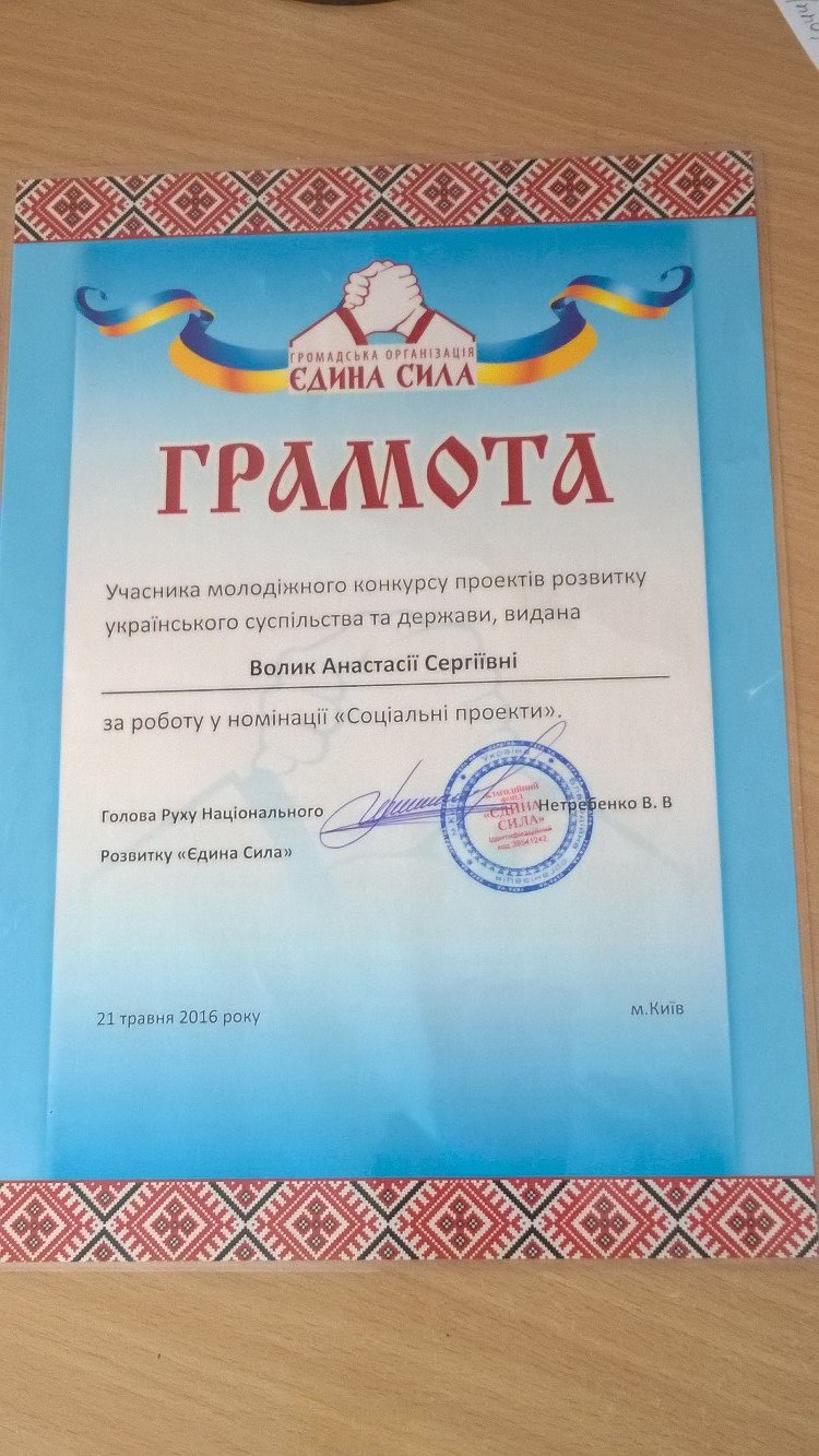Серед 201-го учасника конкурсу була й студентка Інституту соціально-педагогічної та колекційної освіти БДПУ – Анастасія Волик (див. світлини). Студентка отримала Грамоту учасника молодіжного конкурсу проектів розвитку українського суспільства та держави за роботу у номінації "Соціальні проекти". Анастасію запросили до наступної участі в конкурсі та на подальшої співпраці.