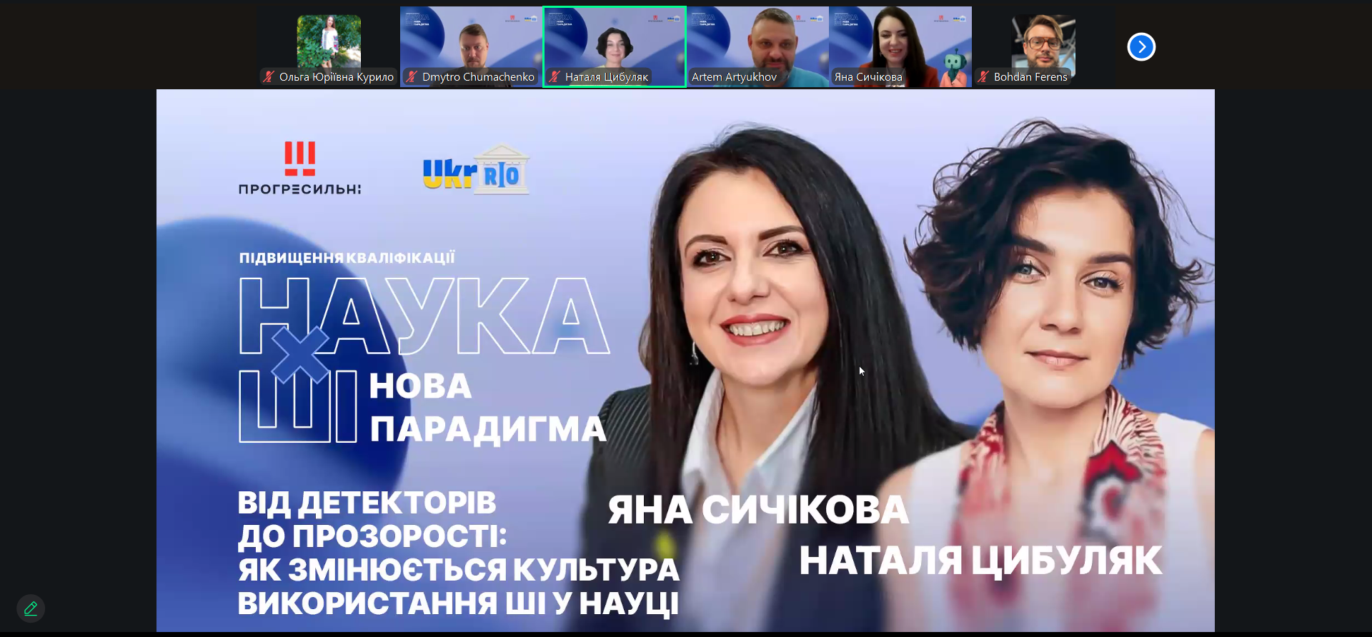 Експертки представили надзвичайно актуальну тему: «Від детекторів до прозорості: як змінюється культура використання ШІ у науці». У фокусі обговорення – деволюція ставлення до ШІ, ризики та міфи щодо детекторів, питання академічної доброчесності, а також практичні орієнтири для науковців щодо відповідального використання цифрових інструментів.
