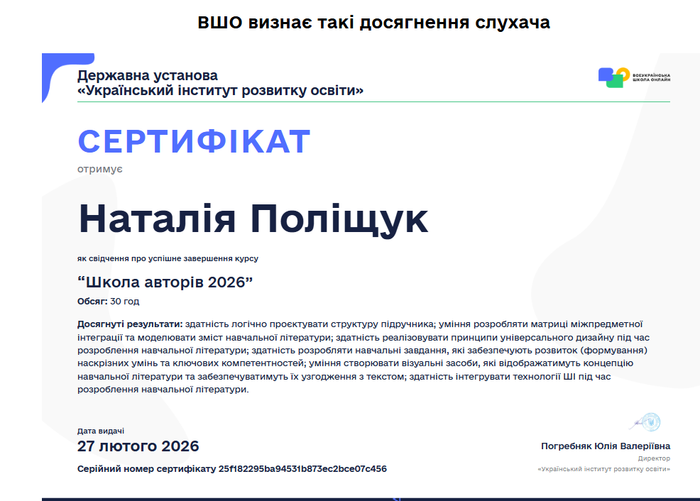 Викладач кафедри фізичної культури, спорту та методики викладання Наталія Поліщук успішно завершила навчання за програмою «Школа авторів 2026», що реалізується Українським інститутом розвитку освіти у межах ініціативи Всеукраїнська школа онлайн.