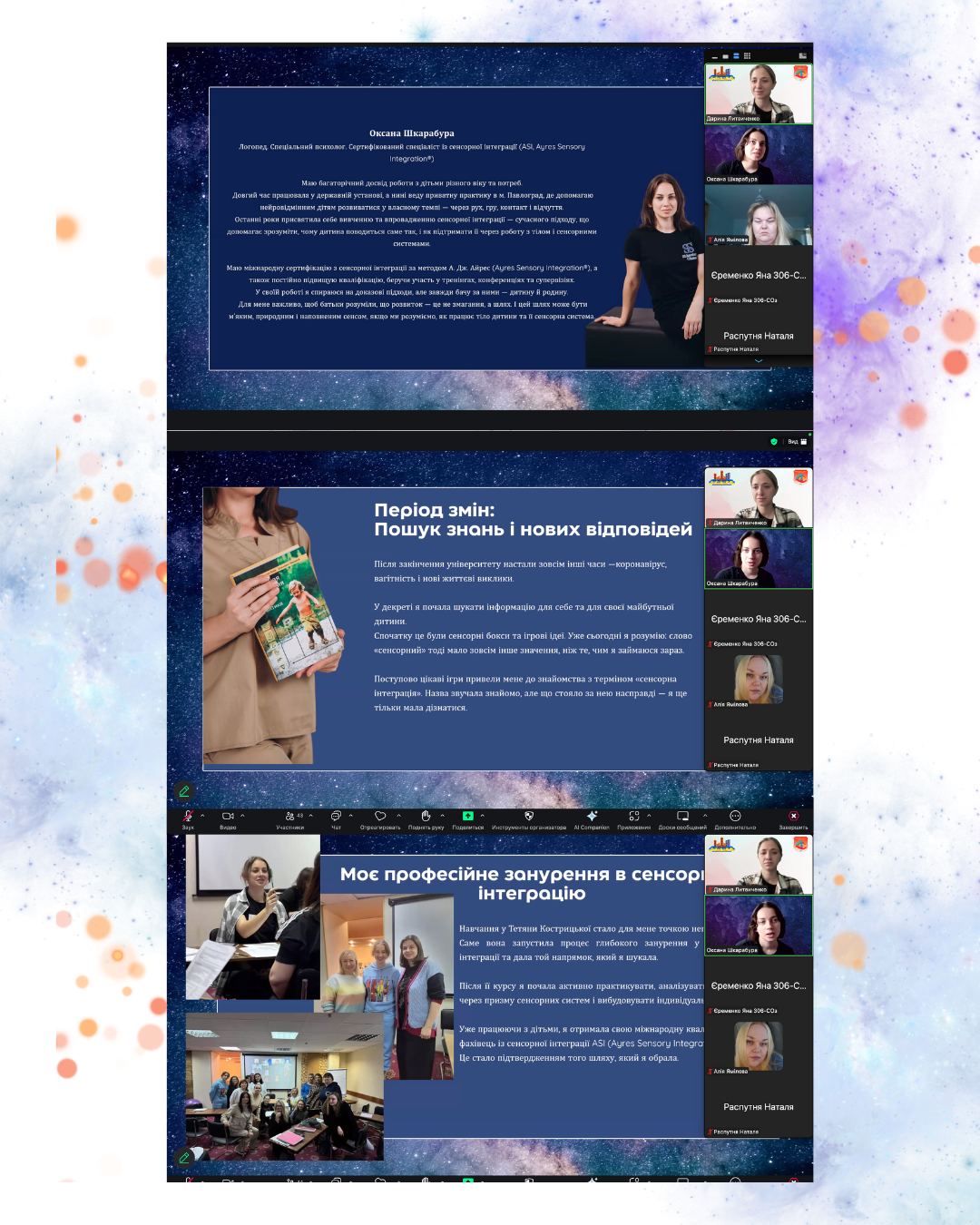 У межах рубрики «ППЛ-поради практикуючих логопедів» команда «Студентського десанту S016» підготувала особливу зустріч, яка стала справжнім містком між навчанням та майбутньою професією. Цього разу здобувачі мали нагоду поспілкуватися з людиною, яка не лише володіє глибокими знаннями, а й щодня втілює їх на практиці — Оксаною Шкарабурою фахівчинею з сенсорної інтеграції ASI та власницею дитячого простору «Sensory Space».