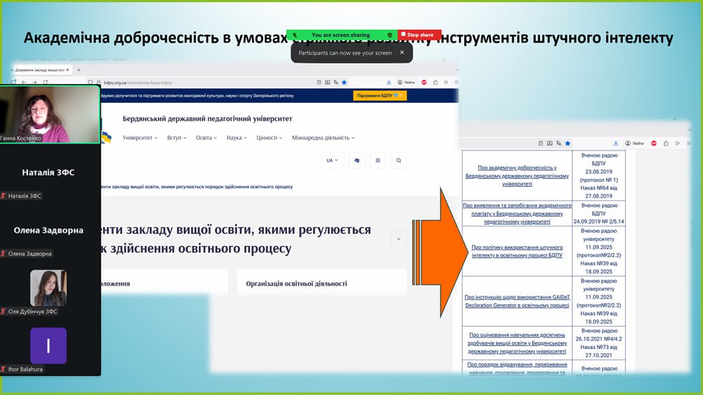 • академічна доброчесність: виклики та шляхи відповідального використання ШІ, де обговорювалося уникнення зловживань інтелектуальними технологіями, розуміння меж дозволеного використання ШІ тощо.