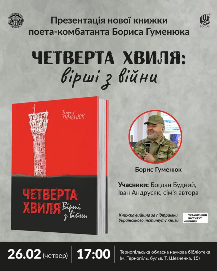 26 лютого у відділі читального залу Тернопільської обласної універсальної наукової бібліотеки спільно з видавництвом «Навчальна книга – Богдан» відбулася презентація збірки Бориса Гуменюка «Четверта хвиля: вірші з війни». Ця книжка стала поетичним свідченням часу – текстами, написаними на межі болю й надії. Поет уклав збірку в лютому 2022 року, а з початком повномасштабного вторгнення добровольцем пішов на фронт і з грудня 2022 року вважається зниклим безвісти під Бахмутом. Модератором зустрічі став Іван Андрусяк – редактор, письменник і літературний критик, товариш Бориса Гуменюка, добре знаний нашому університету. На презентації були присутні письменник Олександр Вільчинський, який знав автора, а також члени родини Бориса Гуменюка, що надало події особливої емоційної глибини.