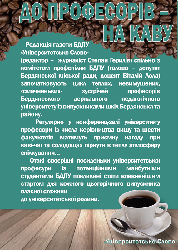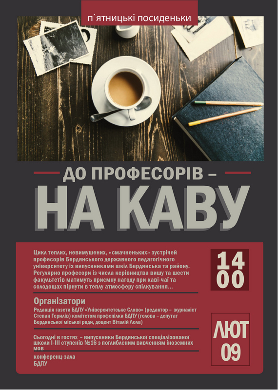 Минулої п`ятниці, 9 лютого, о 14.00 у конференц-залі головного корпусу БДПУ відбулась перша зустріч професорів нашого університету з випускниками Бердянської СШ №16. Це – відкриття нового циклу зустрічей «До професорів – на каву», ініціатором яких став редактор газети БДПУ «Університетське Слово», журналіст Степан Герилів при активній підтримці університетського профкому (голова – депутат Бердянської міської ради Віталій Лола).