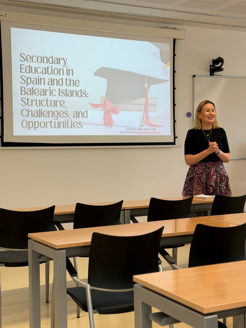 Робочий день на базі University of the Balearic Islands (Ibiza, Іспанія) розпочався з глибокого занурення в систему середньої освіти Іспанії та Балеарських островів. Інспекторка Eva Quirós представила розгорнуту доповідь про структуру, виклики та можливості середньої освіти в регіоні, а інспекторка Adela Bujosa провела рефлексію щодо педагогічного стажування у закладах середньої освіти — цінний досвід для розуміння того, як теорія втілюється у щоденній шкільній практиці.