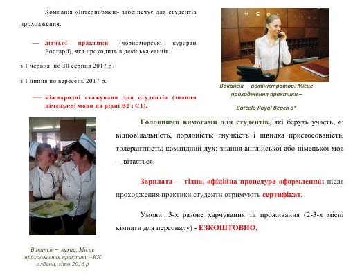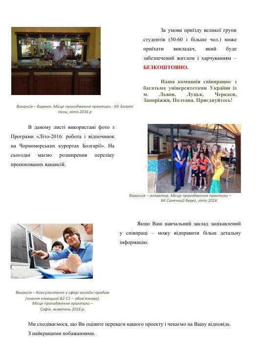 Оплачувана практика здійснюється на базі болгарських курортів. Це відмінний спосіб не тільки поліпшити своє знання мов, поглибити знання та придбати практичні навички, але також чудова можливість отримати безцінний досвід, який безумовно стане в нагоді Вашим студентам в майбутньому професійному житті.
