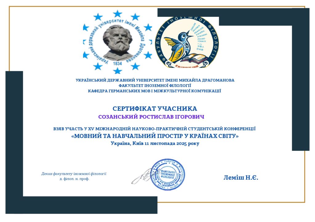Здобувачі вищої освіти долучилися до роботи двох авторитетних наукових форумів – міжнародного та всеукраїнського рівнів, а саме у ХV Міжнародній науково-практичній студентській конференції «Мовний та навчальний простір у країнах світу» (м. Київ, 11 листопада 2025 року) і ІХ Всеукраїнській науковій інтернет-конференції «Діалог мов і культур у сучасному освітньому просторі» (м. Суми, 14 листопада 2025 року). Це дало змогу не лише оприлюднити власні напрацювання, а й набути досвіду академічної комунікації та професійної дискусії.
