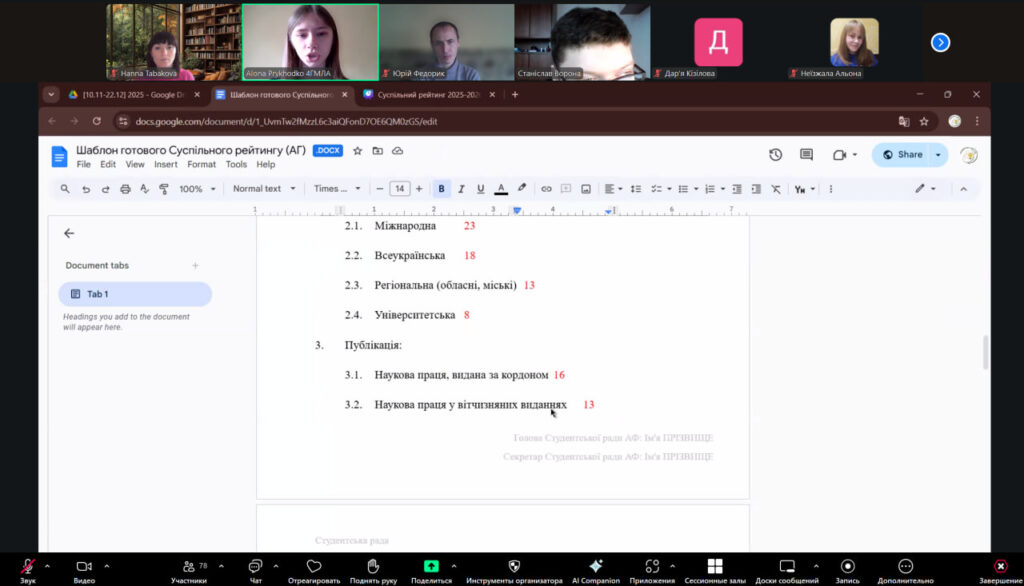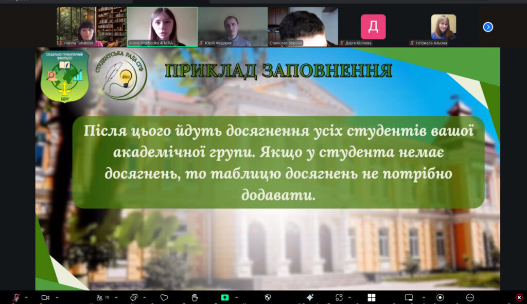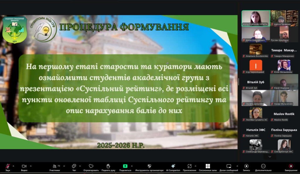 Студентська рада університету розробила форму, яка максимально враховує здобутки у різних сферах кожного студента. З метою роз’яснення кожного етапу заповнення форми суспільного рейтингу студентська рада соціально-гуманітарного факультету на чолі з головою ради, здобувачкою 4 курсу СГФ Альоною Приходько, підготувала і провела спільну кураторську годину. Під час зустрічі куратори та здобувачі отримали можливість побачити, як заповнювати рейтинг, ознайомитися з його складовими і поставити питання.  Студентська рада СГФ підготувала презентацію, де детально розписані усі етапи збору й заповнення інформації.