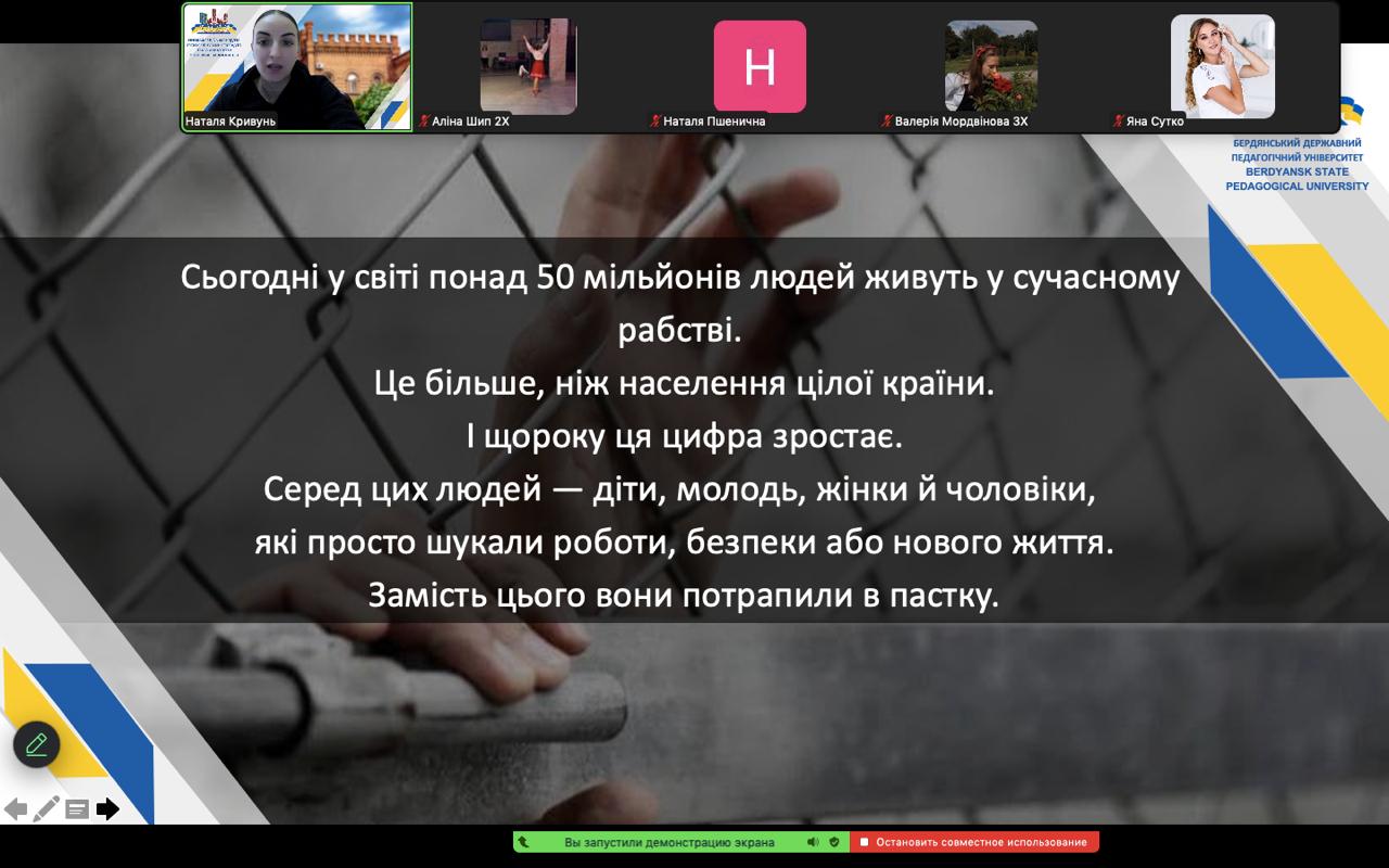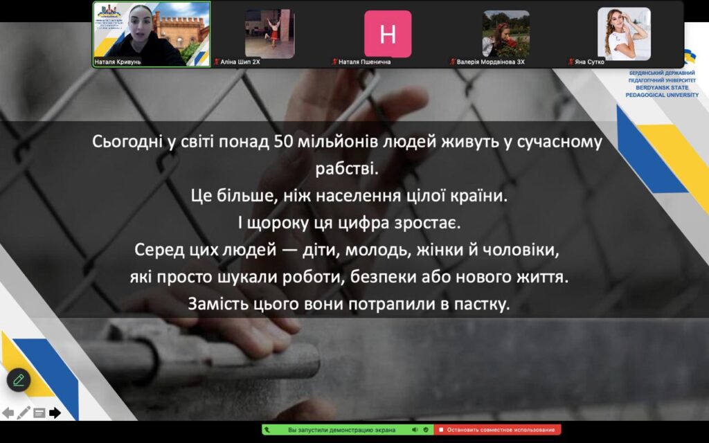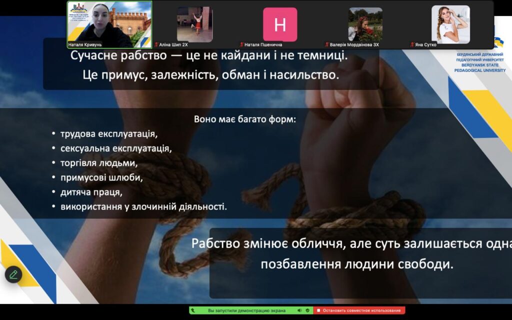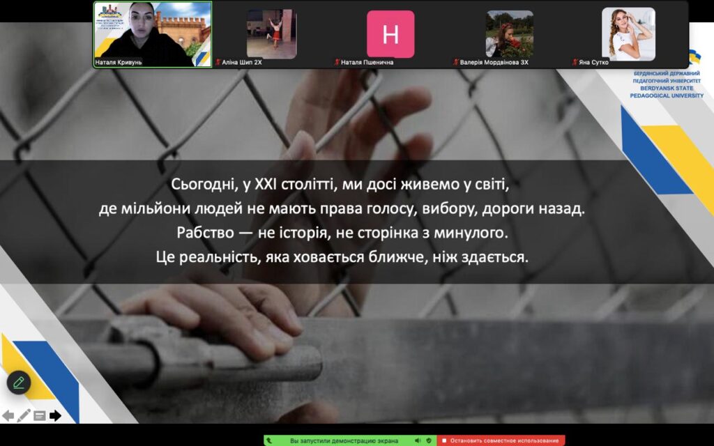 З нагоди Всесвітнього дня боротьби з рабством 2 грудня 2025 року в Бердянського державному педагогічному університеті на факультеті фізичної культури, спорту та здоров’я людини у форматі онлайн відбулася виховна година «Сучасне рабство: усвідомити, щоб запобігти!».