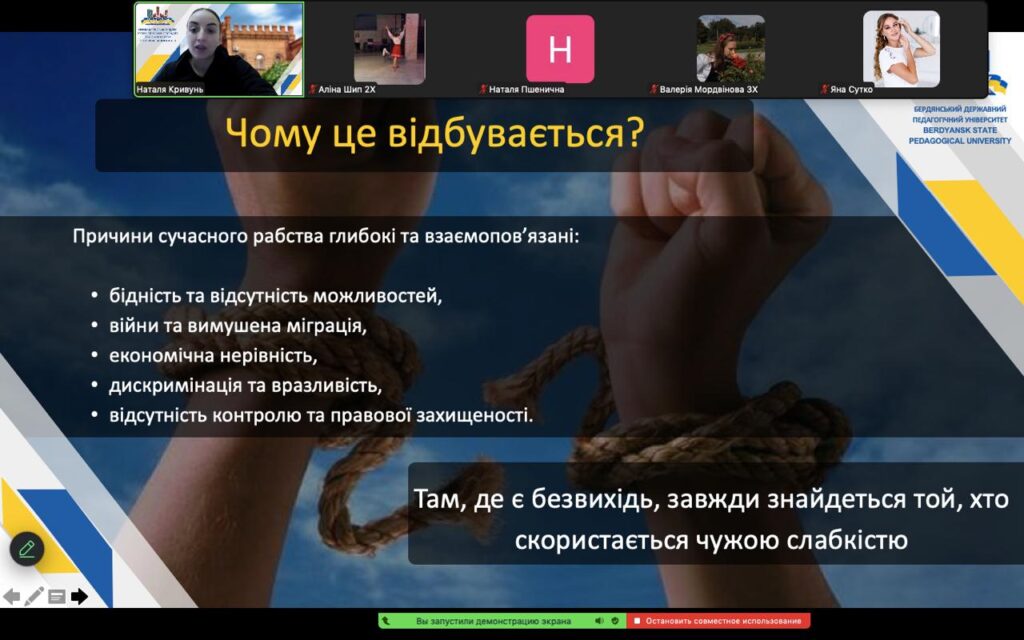 У межах виховної години викладачі та здобувачі вищої освіти переглянули кілька відеоматеріалів, що розкривали різні аспекти проблеми сучасного рабства у світі та в Україні. Особливу увагу було приділено документальному фільму про прояви рабства та експлуатації під час війни в Україні. Перегляд сприяв глибшому розумінню того, як військові дії збільшують вразливість населення та створюють додаткові ризики потрапляння в ситуації експлуатації. Після перегляду учасники мали можливість самостійно осмислити побачене та зробити власні висновки щодо порушених у матеріалі проблем.
