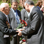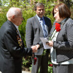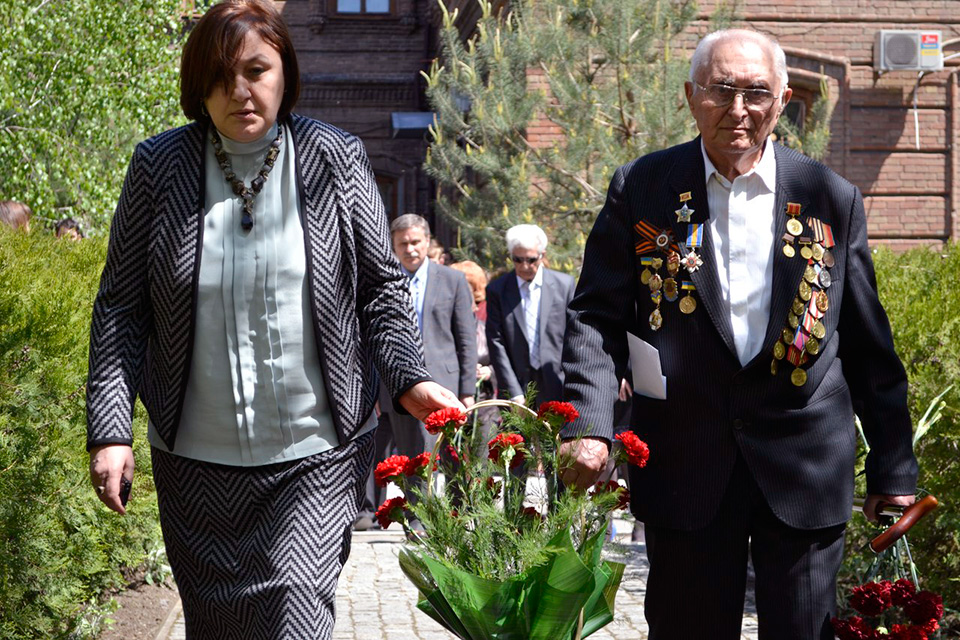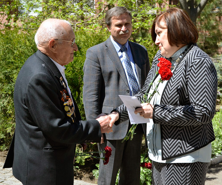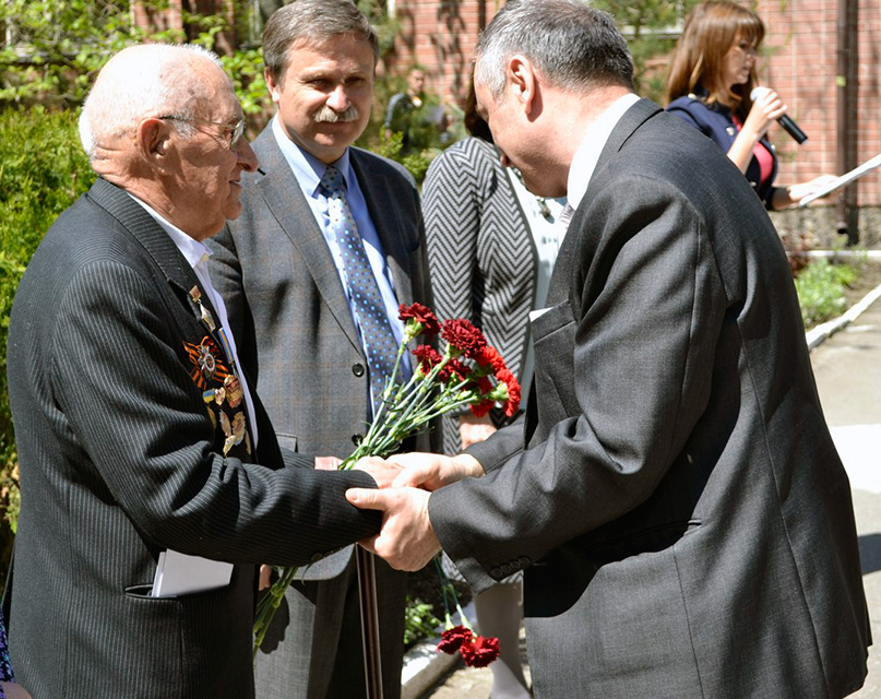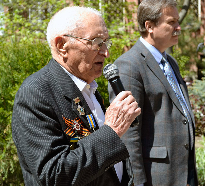 Сьогодні, 7 травня, з перших нот та слів гімну України розпочався мітинг-реквієм, присвячений пам’яті викладачам і студентам університету, загиблим у Великій Вітчизняній війні, що проходив біля обеліска, що знаходиться на території 1-А корпусу БДПУ. Перший проректор університету Володимир Федорик та голова студентської ради Вікторія Яременко, вітаючи ветеранів, запевнили, що ми завжди берегтимемо в пам’яті поколінь цінність та Велич Перемоги, а слова Володимира Михайловича: «Ви – перемогли тоді, ми – не дамо нас завоювати сьогодні!» – викликали гордість кожного з присутніх! Безмежну радість принесли присутність та виступ на мітингу-реквіємі кандидата економічних наук, ветерана Великої Вітчизняної війни Юрія Юхна, якого згодом щиро вітали та вручали йому квіти-подарунки ректор БДПУ, професор Вікторія Зарва та голова комітету профспілки Віталій Лола (див. світлини).
