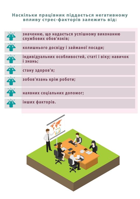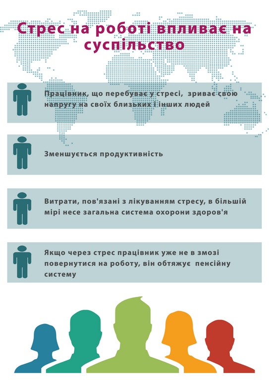 За словами професора Наталі Сосницької, психосоціальні ризики та стрес на робочому місці є одними з найскладніших питань у сфері охорони праці та здоров’я, актуальність яких загальновизнана для всіх країн та професій, особливо для працівників соціально-культурної сфери. У тривалій перспективі стрес на робочому місці може призвести до виникнення безсоння, емоційного занепокоєння, мігрені, хронічної втоми, депресії, алергії, захворювань опорно-рухового апарату, гіпертонії, виразкової хвороби шлунку, захворювань серцево-судинної системи, серцевого нападу, нещасного випадку та навіть самогубства.