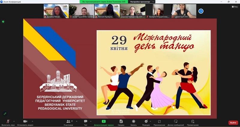 29 квітня на факультеті психолого-педагогічної освіти та мистецтв (в.о. декана – кандидатка педагогічних наук, доцентка Анжеліка Лесик) було проведено виховну годину «Танцювальний подих», присвячену Міжнародному дню танцю. Модерувала захід кандидатка педагогічних наук, доцентка кафедри теорії та методики навчання мистецьких дисциплін (завідувачка – кандидатка педагогічних наук, доцентка Віра Бурназова) БДПУ Юлія Тараненко.