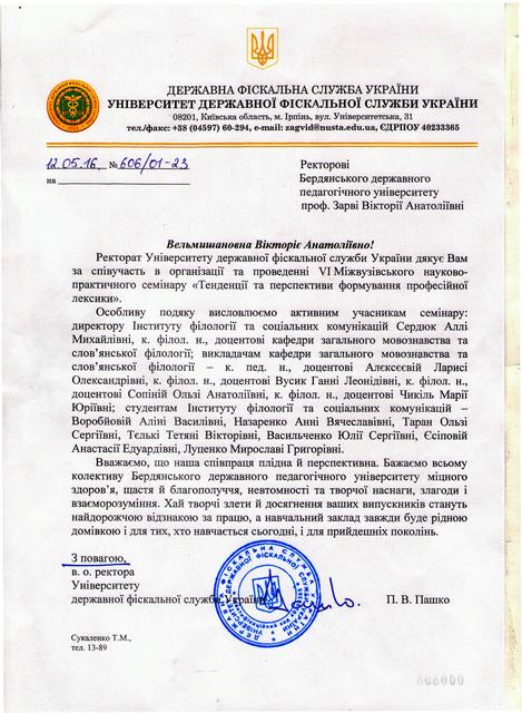 Після проведення семінару до ректорату БДПУ надійшов лист-подяка від ректорату Університету державної фіскальної служби України за співучасть в організації та проведенні VІ Міжвузівського науково-практичного семінару «Тенденції та перспективи формування професійної лексики». У листі особисто подякували активним учасникам семінару: директору ІФСК Аллі Сердюк, доцентам кафедри загального мовознавства та слов’янської філології Ларисі Алєксєєвій, Ганні Вусик, Ользі Сопіній, Марії Чикіль; студентам ІФСК – Аліні Воробйовій, Анні Назаренко, Ользі Таран, Тетяні Тєлькі, Юлії Васильченко, Анастасії Єсіповій, Мирославі Луценко.