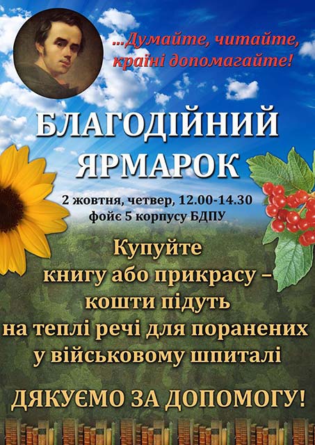 Вторговані сьогодні кошти підуть на придбання теплих речей пораненим бійцям, що проходять курс лікування в військових шпиталях. Незмінна Господиня ярмарку, професор кафедри зарубіжної літератури та теорії літератури БДПУ Софія Філоненко разом із своїми «бойовими помічниками», як і минулого разу, організувала все на високому рівні.