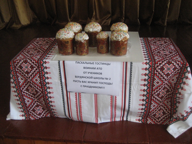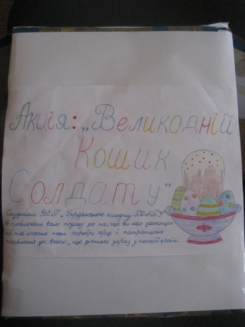 Колективи Бердянського коледжу Таврійського державного агротехнологічного університету (директор – Галина Шишкіна) та Бердянського центру професійно-технічної освіти (Василь Гищук) також разом із Великодніми кошиками просили передати хлопцям на передовій «смачної паски-ковбаски» й побажання сили та мужності в боротьбі з жорстоким ворогом. Мирного неба нам усім!!!