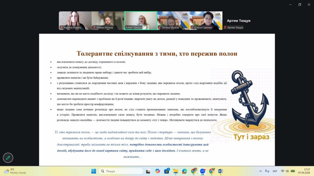 7 квітня 2026 року здобувачі третього (освітньо-наукового) рівня вищої освіти в межах вивчення дисципліни «Інклюзивні підходи в освіті» (викладачка – докторка педагогічних наук, професорка Ольга Гуренко) долучилися до гостьової лекції кандидатки педагогічних наук, доцентки кафедри прикладної психології та логопедії Аліни Синиці на тему «Толерантне спілкування з ветеранами війни та людьми, які пережили полон».