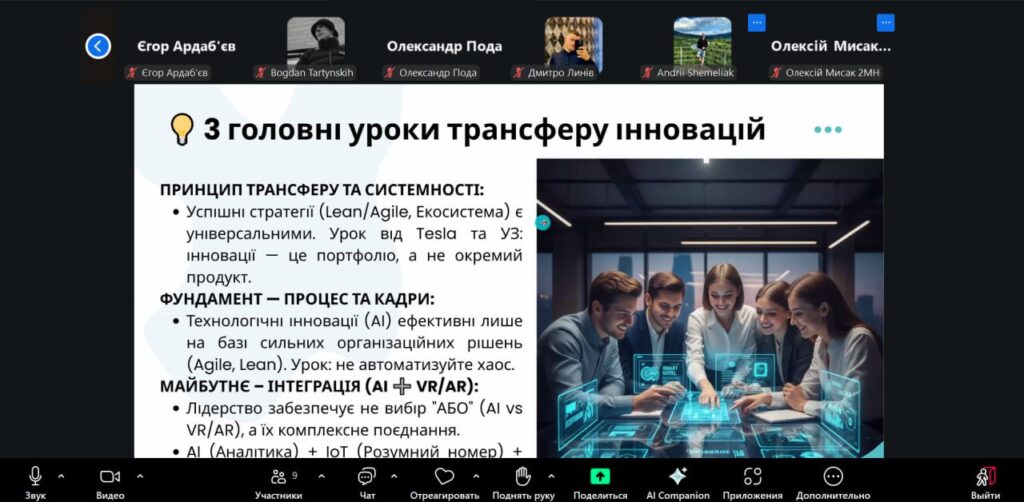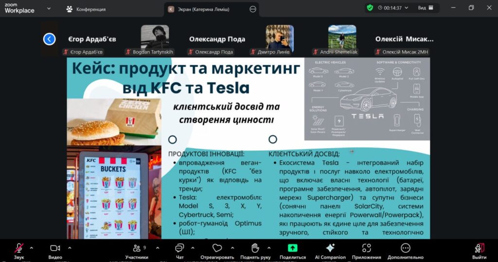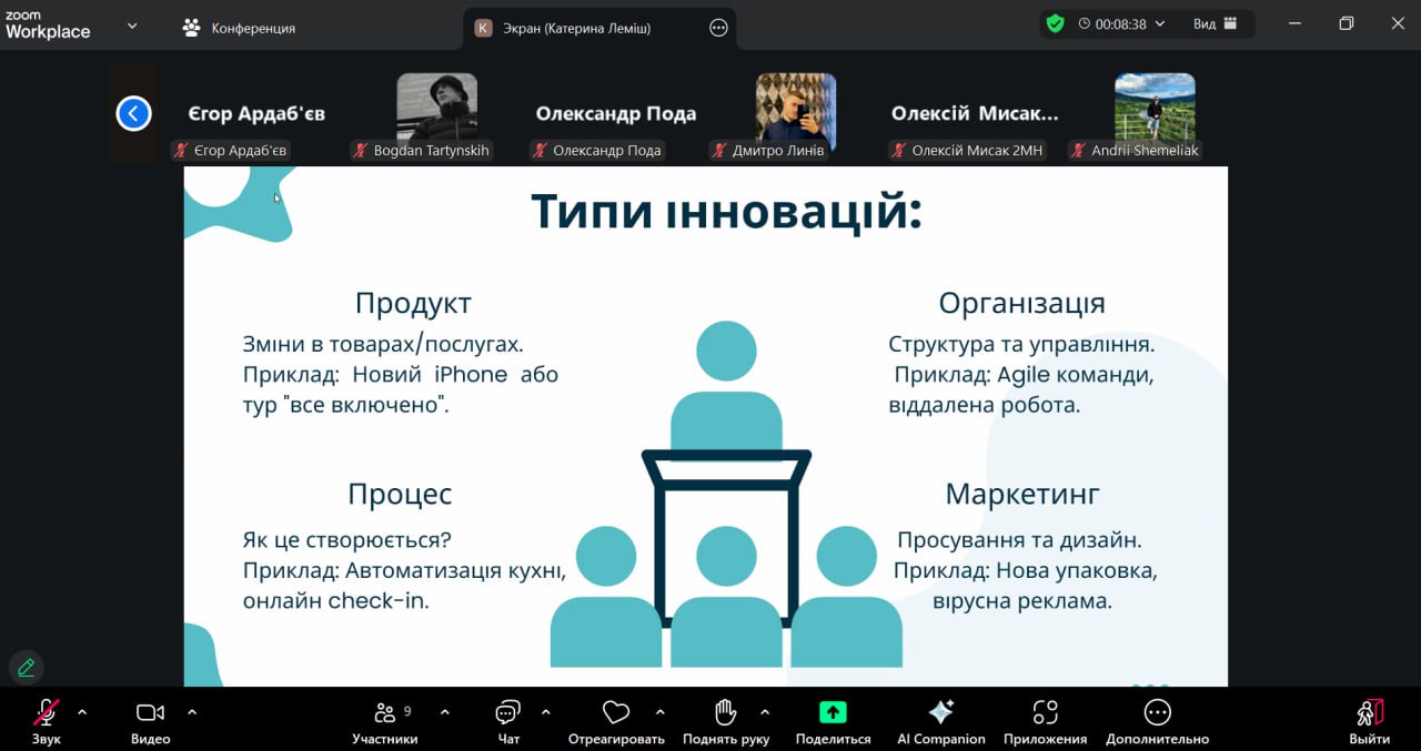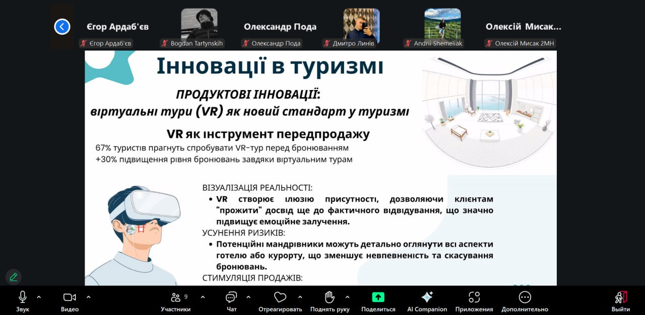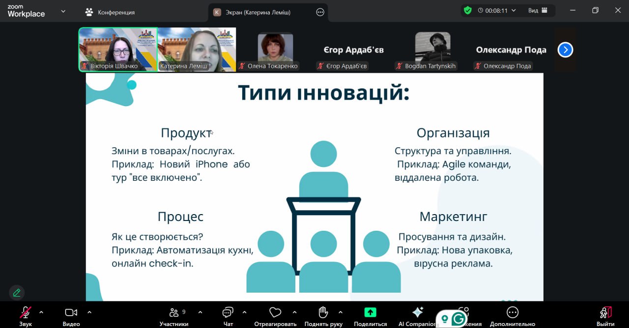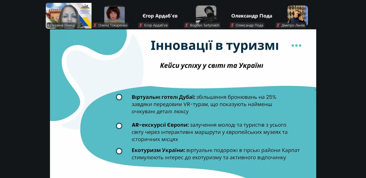 У ході заходу було проаналізовано інноваційні стратегії компаній Tesla, KFC та АТ «Укрзалізниця». Основна увага приділялася класифікації та потенціалу впровадження чотирьох типів інновацій у готельно-туристичному сервісі. Зокрема розглядалися організаційні та процесні інновації, спрямовані на підвищення операційної ефективності шляхом упровадження принципів Lean Management і Agile-управління для оптимізації внутрішніх процесів та покращення якості сервісу, а також продуктові й маркетингові інновації, орієнтовані на створення споживчої цінності, формування комплексних продуктово-сервісних екосистем і оперативне реагування на соціальні та поведінкові тренди туристичного ринку.