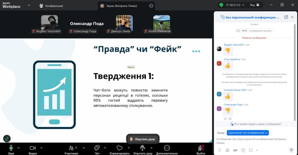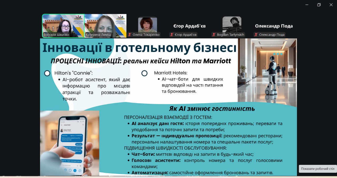 Окремий тематичний блок було присвячено застосуванню цифрових технологій у сфері гостинності, зокрема інструментів штучного інтелекту та віртуальної й доповненої реальності. Штучний інтелект розглядався як інструмент персоналізації послуг, автоматизації комунікацій із клієнтами (чат-боти 24/7), оптимізації операційних витрат і підвищення якості обслуговування. Було проаналізовано практичні приклади використання AI в міжнародних готельних мережах. Технології VR/AR представлено як ефективні засоби передпродажної комунікації, що формують клієнтський досвід, знижують ризики при виборі туристичного продукту та сприяють зростанню кількості бронювань.