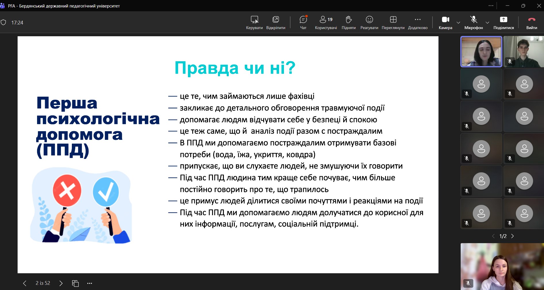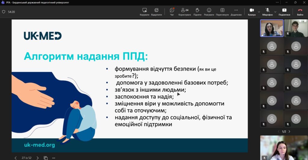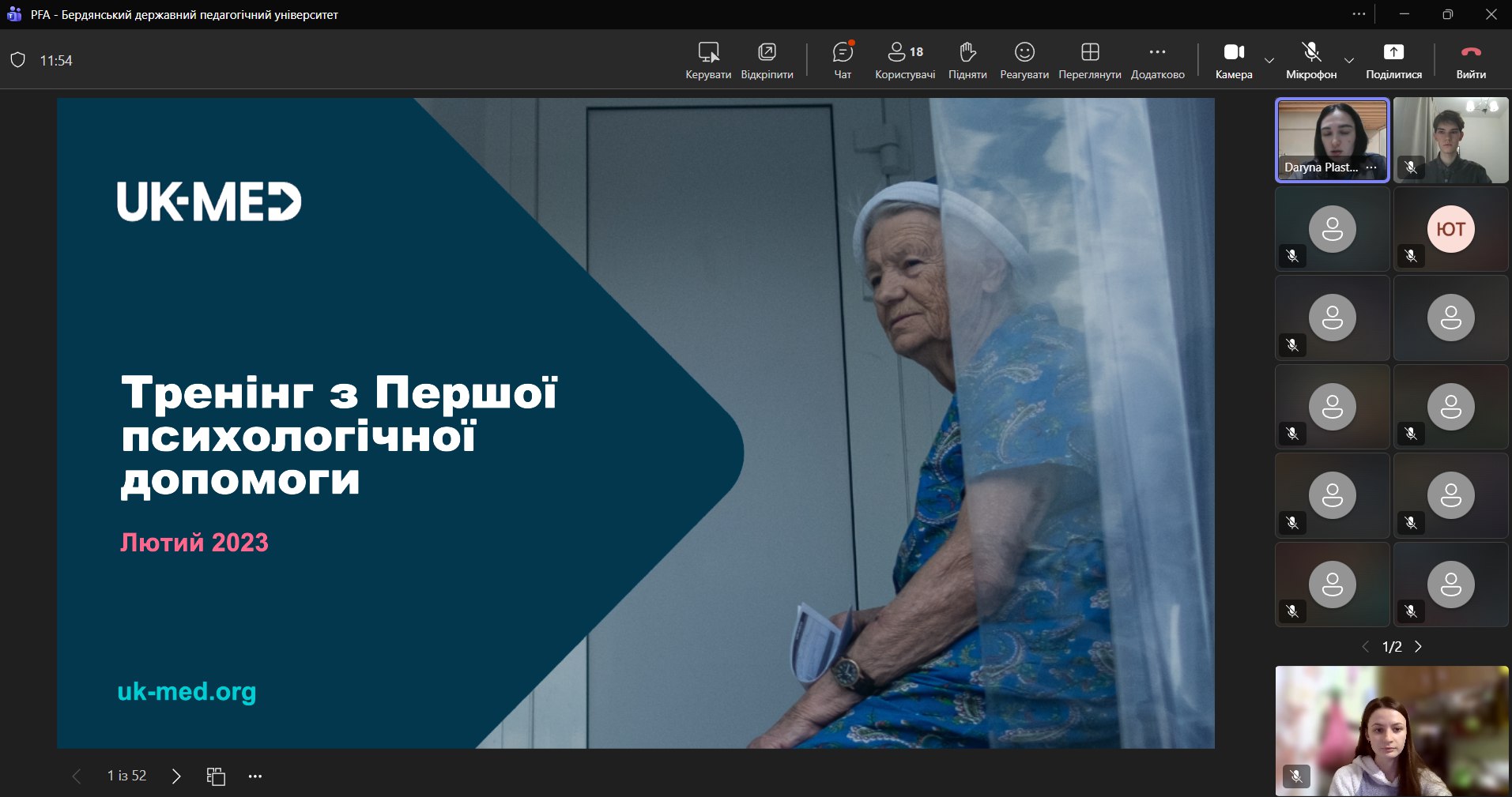 3-4 грудня 2025 року для здобувачів вищої освіти Бердянського державного педагогічного університету відбувся тренінг з надання першої психологічної допомоги. Тема надання психологічної допомоги наразі дуже актуальна в Україні, адже велика кількість людей стикаються зі стресом, емоційним виснаженням та наслідками травматичних подій. Саме тому навички підтримки себе та оточуючих в кризових ситуаціях такі важливі.