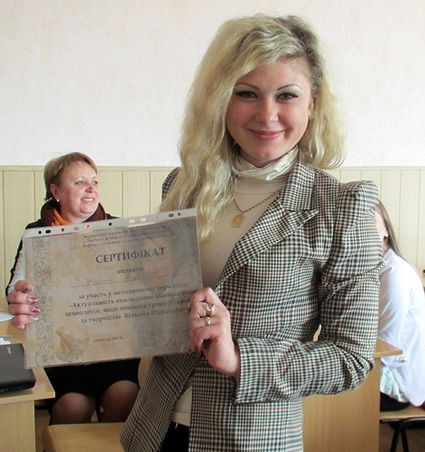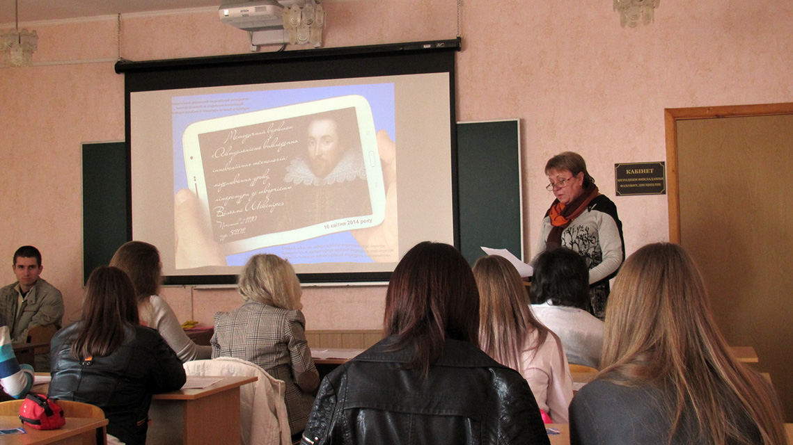 Викладачі кафедри Співак І. Е. , Харіна О. О. і Харіна О. І. провели методичний воркшоп «Актуальність викладання інноваційних технологій: моделювання уроку літератури за творчістю В. Шекспіра». З презентаціями фрагментів уроків виступили студенти 51 і 53 групи ІФСК. Найкращою була визнана презентація «Використання проблемних технологій на уроках світової літератури під час вивчення п’єси «Гамлет» В.Шекспіра» Валерії Куропятник, яка й отримала почесну грамоту.