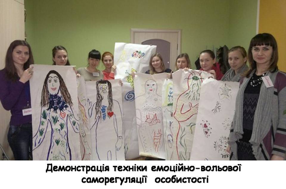 Включилися в роботу та провели свої майстер-класи й молоді спеціалісти. Так, сертифікований арт-терапевт, провідний фахівець навчальної психолого-консультативної лабораторії Тетяна Ляхор разом зі студентами опрацювала арт-терапевтичну техніку з емоційно-вольової саморегуляції «Відображення власного «Я». Результатом роботи стало усвідомлення своїх тілесних «затисків» – областей підвищеної м’язової напруги, пов’язаних з недостатньо вираженими емоціями; прийняття власного тілесного образу, мобілізація творчого потенціалу людини, внутрішніх механізмів саморегуляції та зцілення.
