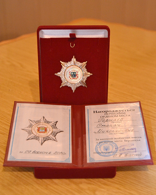 Від імені виконавчого комітету та депутатського корпусу за особливі заслуги та вагомий внесок у розвиток Бердянська головного редактора нагородили почесним орденом міста. Ця нагорода давно «чатувала» на Степана Миколайовича. Він завжди готовий прийти на допомогу. І саме він організовує безліч благодійних заходів, підтримує інвалідів, залучає кошти для допомоги розумним студентам не тільки нашого університету, співпрацюючи з американським Фондом імені Катерини Ковшевич.