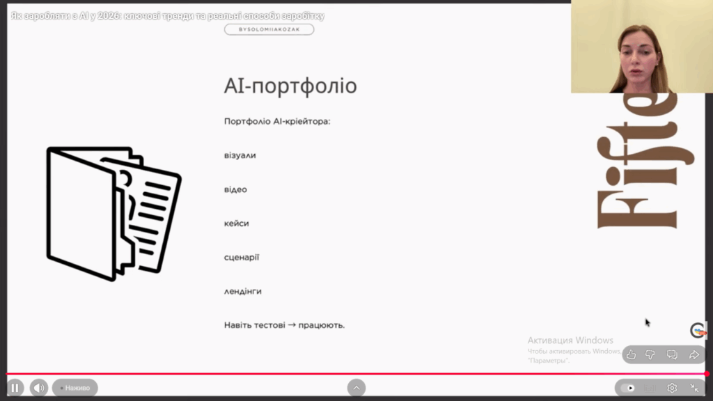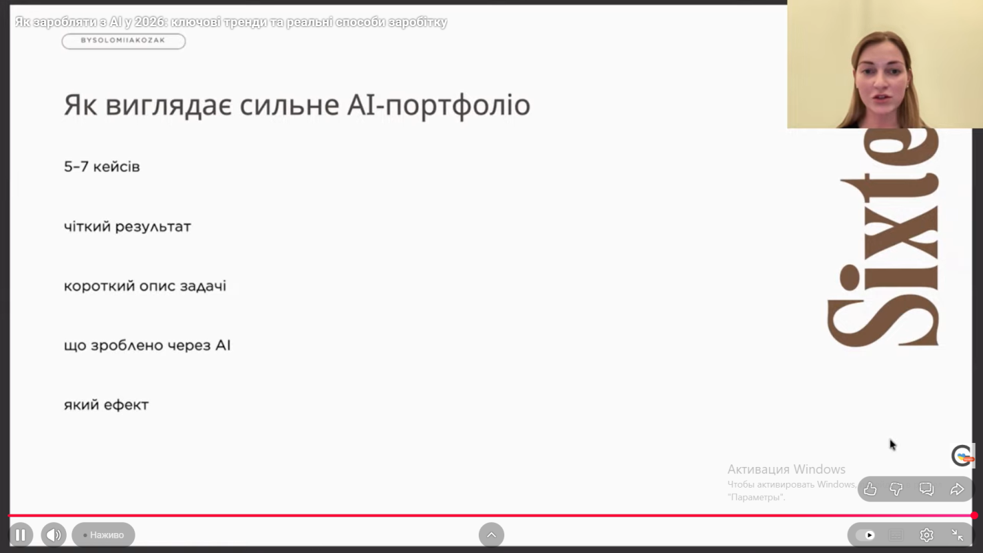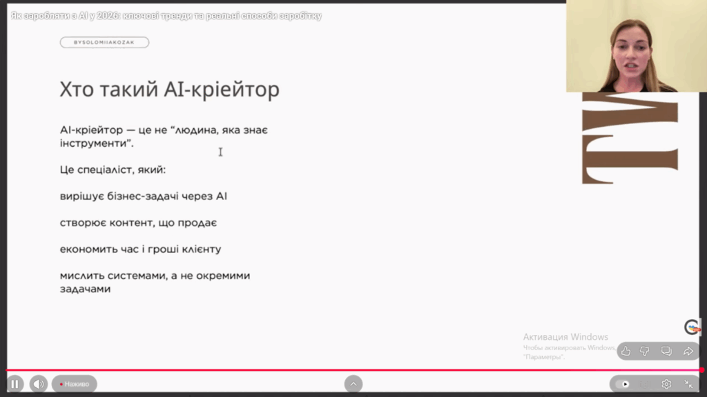 У межах вебінару було розглянуто сучасні тенденції розвитку штучного інтелекту та особливості його впливу на трансформацію ринку контенту у 2026 році. Окрему увагу приділено концепції діяльності AI-кріейтора як нового напряму професійної реалізації, що передбачає застосування AI-інструментів для автоматизації креативних процесів і формування альтернативних джерел доходу без необхідності наявності глибоких технічних знань.